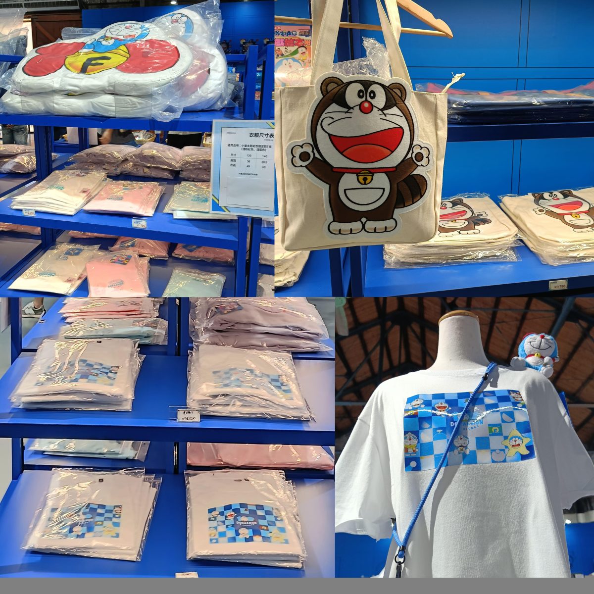 旅行袋、旅行摺疊托特包(漫畫家哆啦、狸貓(浣熊機)哆啦)、小童紀念主題衣服、連帽衛衣、白色主題紀念服飾,貨量充足。另外台灣展覽限定的「光柵服飾」已經上架,圖案為特殊材質,不同角度會有光影變化。