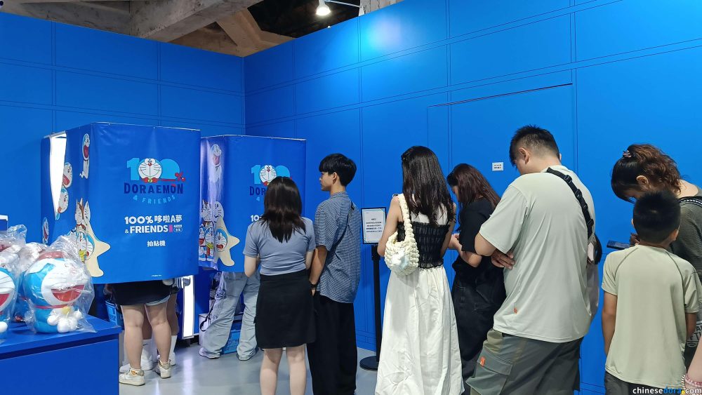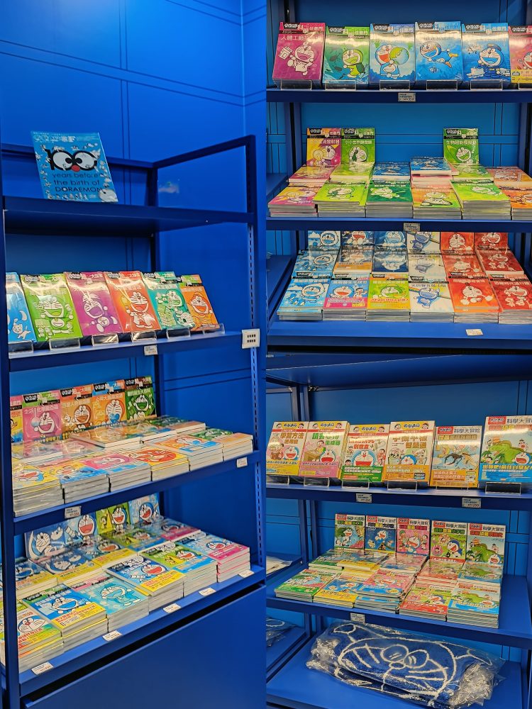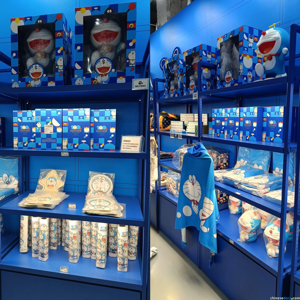 紀念品商店入口情況:原本擺放鑰匙圈娃娃與公仔層架,放置100%朋友召喚鈴抱枕、爆米花桶、萬用墊、裁型滑鼠墊(珍奶哆啦A夢、海星哆啦A夢)、連帽毛巾。
