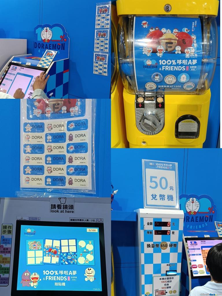 扭蛋胸章、拍貼機、姓名貼機台使用一次皆為新台幣 100 元(2枚50元硬幣),旁邊有提供兌換 50 元硬幣的機台。