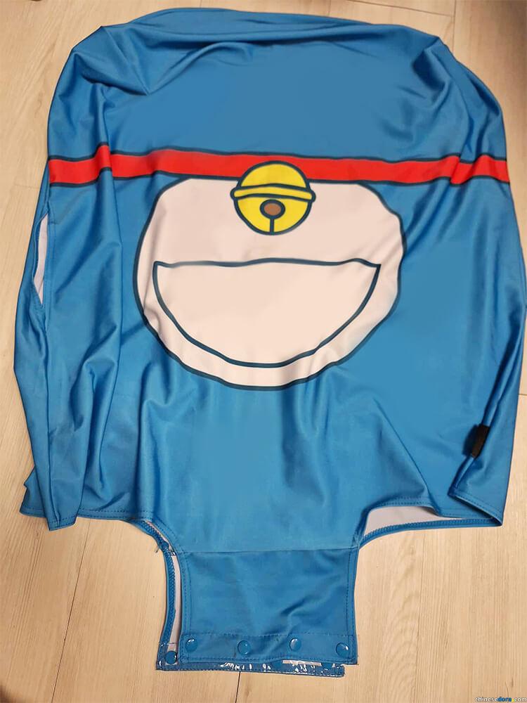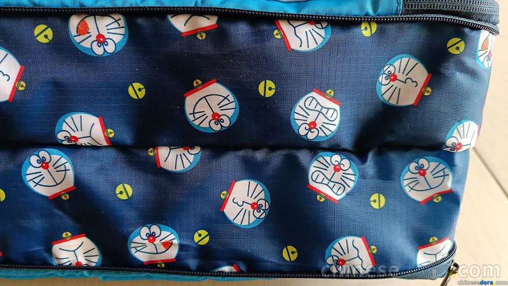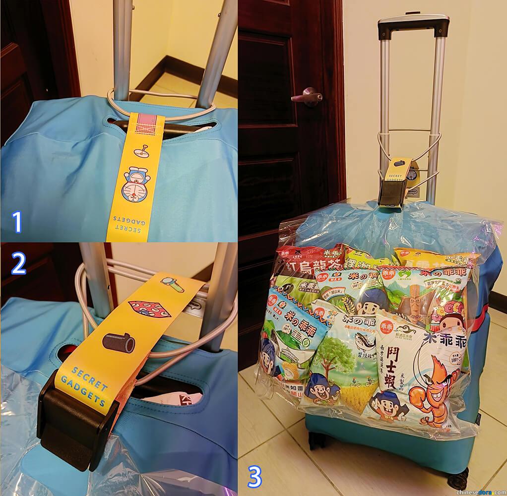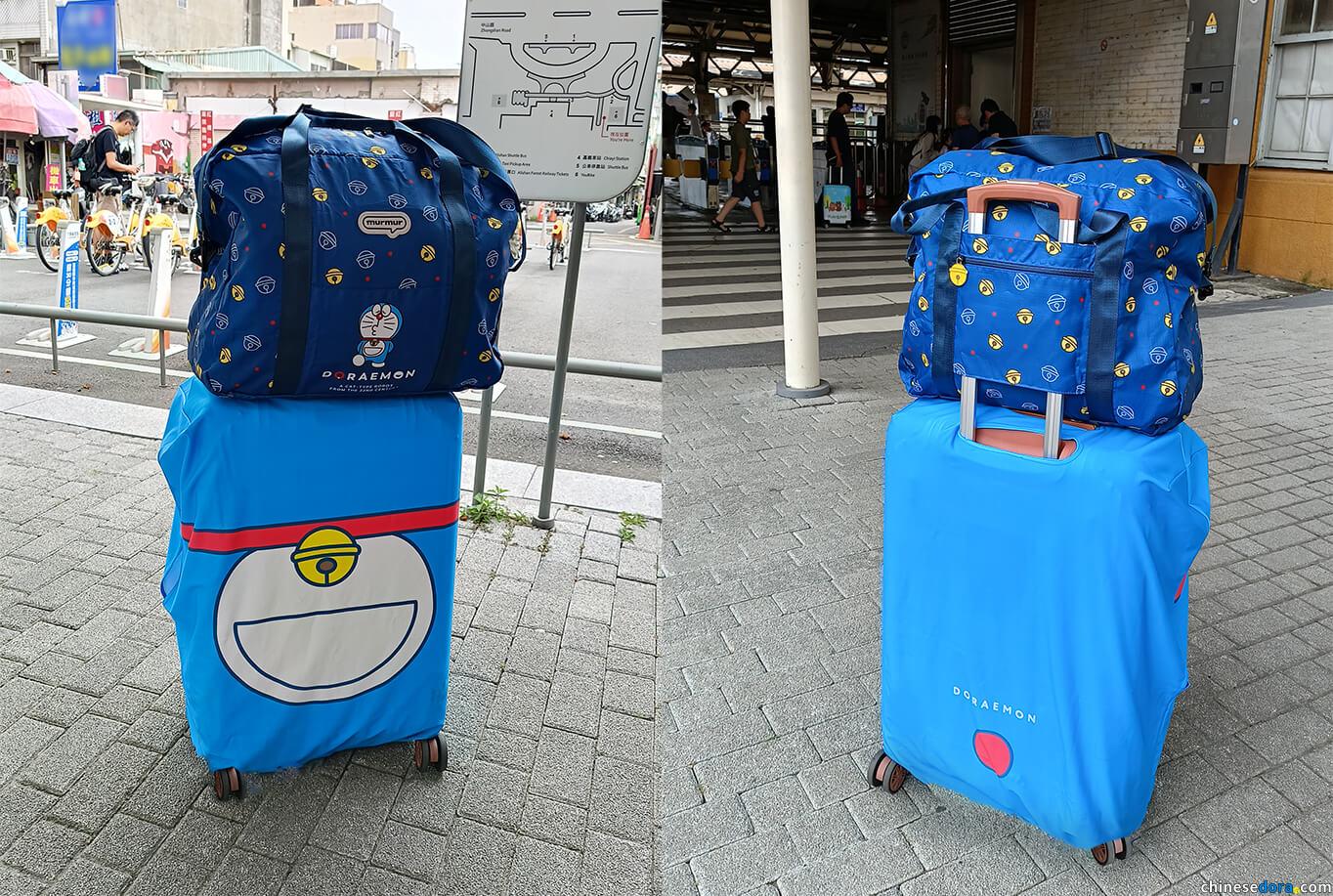 最後回程,就拿出哆啦A夢的巴豆(肚子)吧!正面是四次元百寶袋的圖案、背面是他的紅色尾巴。套上行李箱後,下面有四個鈕扣,扣上去後,就完成幫自己的行李箱穿上哆啦A夢的肚皮了!行李箱的把手、拉桿的部分都有開洞,套上去也不影響使用。