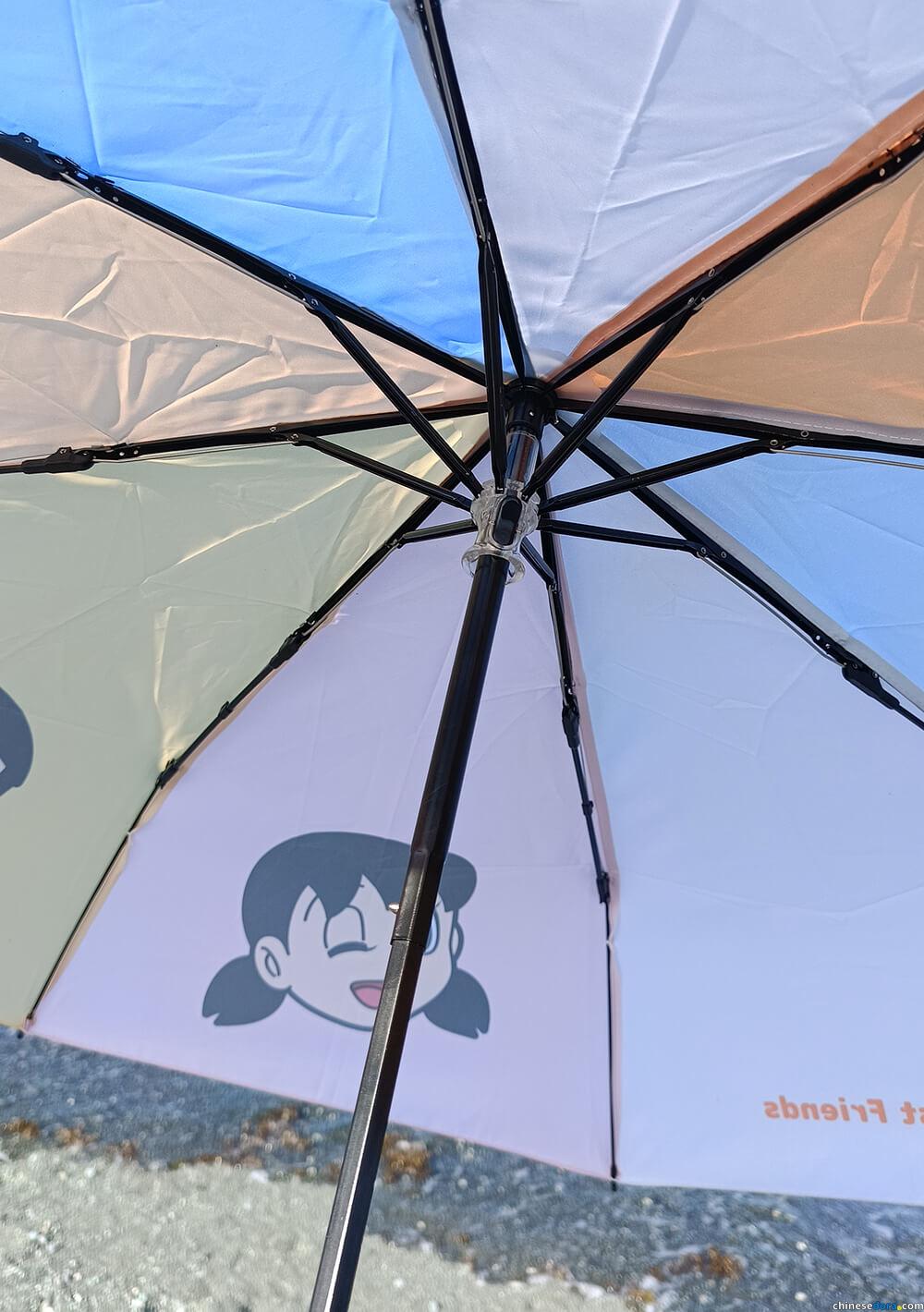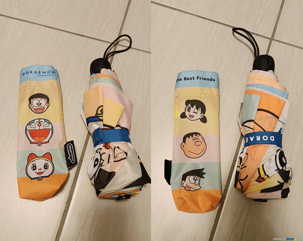 傘套與傘面搭配配色很繽紛,並且支撐傘骨的部分是較牢固的塑膠。這把折疊傘的傘面沒有做抗UV的材質,適合用於下雨時使用,讓六位好朋友與你一起撐傘吧。