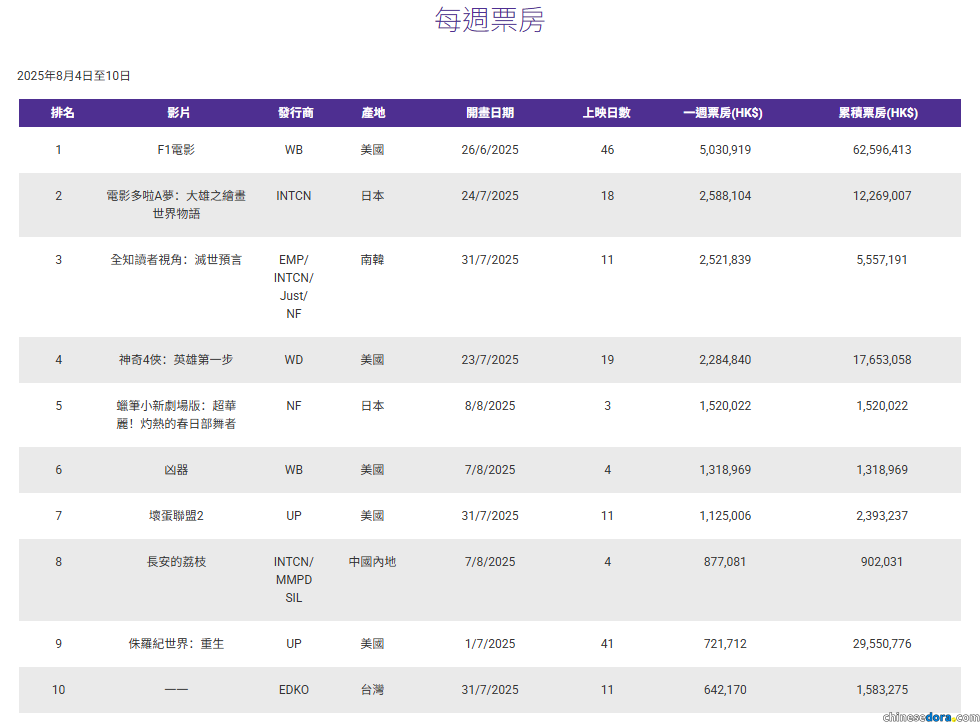 2025 年 8 月 4 日至 8 月 10 日香港電影票房。(資料圖片,HKTDC 截圖)