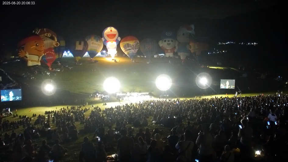 表演活動過程中,後方地勤工作人員正悄悄將熱氣球進行膨脹作業呢!從直播畫面來看,光雕音樂會的人數眾多,幾乎將大草皮觀賞區坐滿!