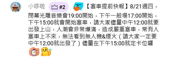 「鹿野高台-花東縱谷即時影像 YouTube」聊天室中,貓型機器人「小哆啦」還是繼續進行小叮嚀,明天(8/21)為熱氣球嘉年華活動的最後一天,晚間有閉幕光雕音樂會,沒有持續下雨的話,晚上 7 點活動會準時開始。開車上山的人,請中午 12 點就要準備上去鹿野高台,往年常常有人塞車上不來,騎機車還是最方便的,把握今年哆啦A夢熱氣球與無人機表演的尾聲吧!