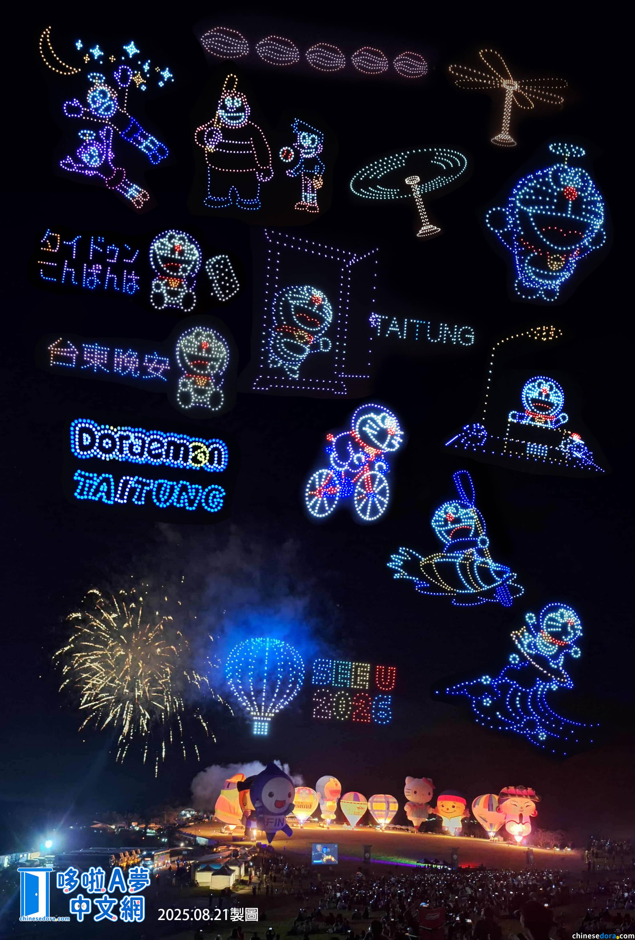 熱氣球飛行團隊以噴火器繞場揭開暖身序幕,閉幕光雕音樂會更是全場焦點。這次無人機表演為 7/17第一場光雕音樂會 的圖案,現場播放大山羨代版與水田山葵版兩個世代的《哆啦A夢》主題曲,伴隨熱氣球燃燒火焰節奏、無人機表演點亮夜空,不僅喚起現場大小觀眾跨越時代的共同回憶,也象徵了熱氣球嘉年華15年來活動傳承的精神。最後煙火的綻放,搭配「SEE U 2026」跟熱氣球的圖案中,畫下了完美句點,宣告2025年臺灣國際熱氣球嘉年華正式落幕。