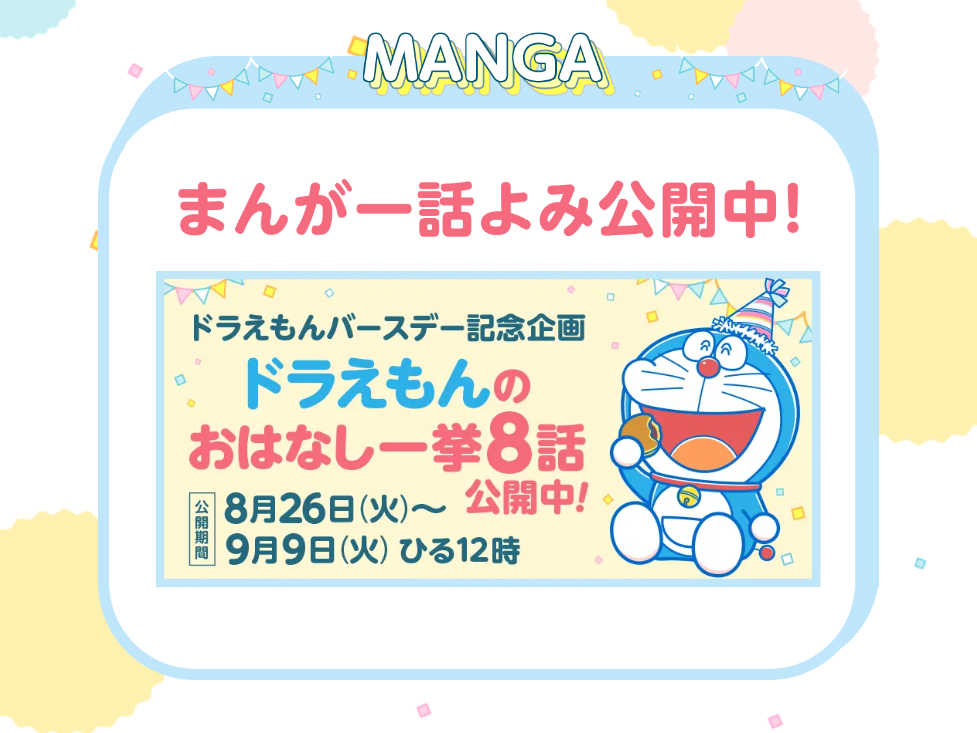 這次的「漫畫一話閱讀專區」作為生日特別企劃,帶來滿滿 8 則精采有趣的《哆啦A夢》故事!分別是《100% 哆啦A夢 & Friends》巡迴特展出現的雕塑〈哆啦A夢分身術〉(ドラえもんだらけ,收錄於第 5 集)、〈哆啦A夢的歌聲〉(ドラえもんの歌,收錄於第 7 集)、〈喪失自信機〉(自信ぐらつ機,收錄於第 37 集)、〈夢境幻想槍〉(ツモリガン,收錄於第 20 集)、〈地底的太陽能乾冰源〉(地底のドライ・ライト,收錄於第 33 集)、〈搗天地藏〉(天つき地蔵,收錄於第 36 集)、〈哆啦A夢生重病?〉(ドラえもんが重病に?,收錄於第 45 集)、〈老鼠與炸彈〉(ネズミとばくだん,收錄於第 7 集),下次更新預定時間為 9 月 9 日(週二)中午12點左右。