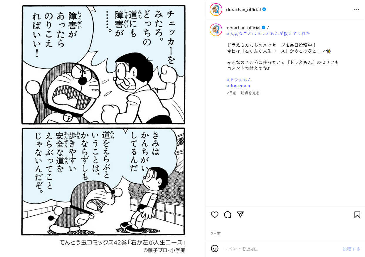另外在日本哆啦A夢官方的社群平台,每天早上都會釋出「DORAKOTOBA」為《哆啦A夢》漫畫的經典名言系列,為早上上班上學的人們給予鼓勵。你也想每天早上起床得到哆啦A夢的名言鼓勵,也可以追蹤日本官方的Facebook、Instagram社交平台唷!