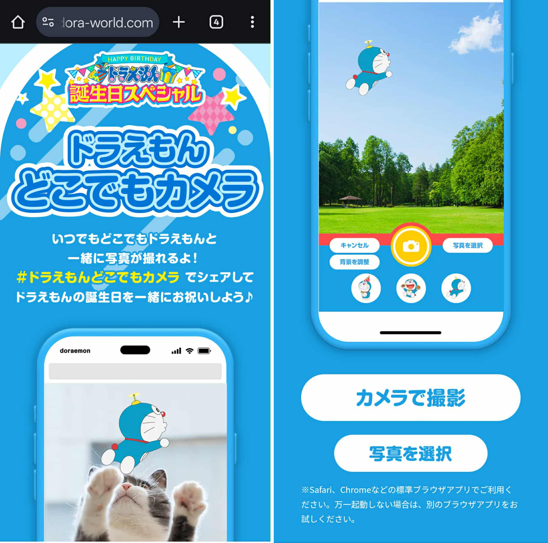為了紀念 9 月 3 日哆啦A夢(港譯:多啦A夢)的生日,日本官方網站特別推出 AR 相框「哆啦A夢 任意相機」(ドラえもんどこでもカメラ),有三種圖案的哆啦A夢可以與他一起快樂合照唷!