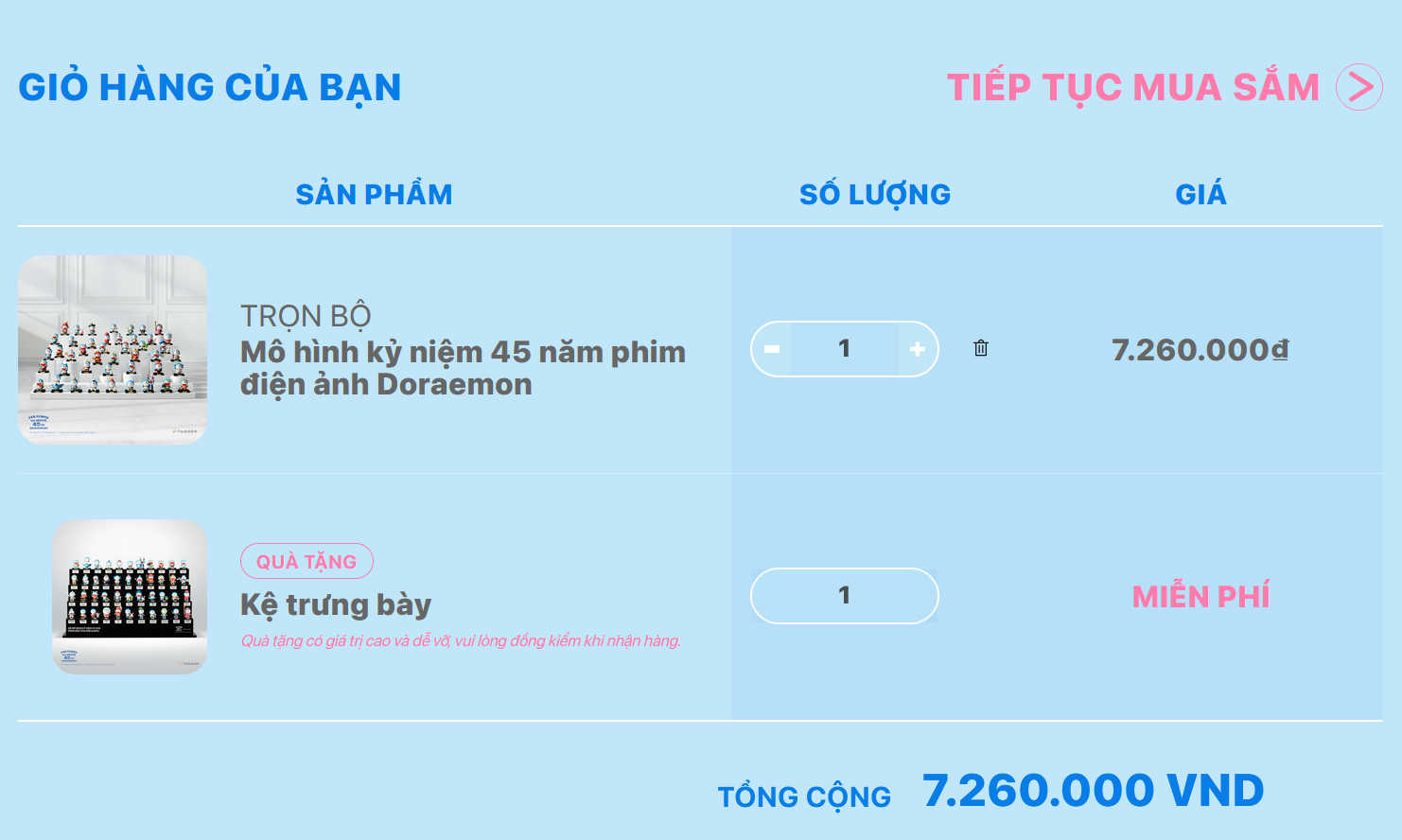 「哆啦A夢電影45週年紀念收藏系列」販售價格為 7,260,000 越南盾,約等於 8370 新臺幣,訂購還送黑色展示架當作贈品。此價格是精品收藏等級的商品,若你也想收藏與哆啦A夢的這份回憶,可詢問越南當地的代購喔!