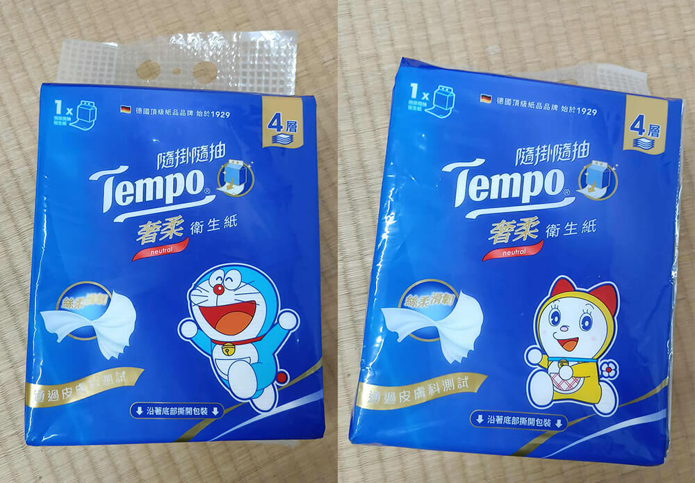 先前本站報導過,德國家用紙品牌 TEMPO 在台灣推出哆啦A夢包裝的衛生紙用品,目前在康是美(COSMED)也能以加價購購買到限定包裝的衛生紙囉!