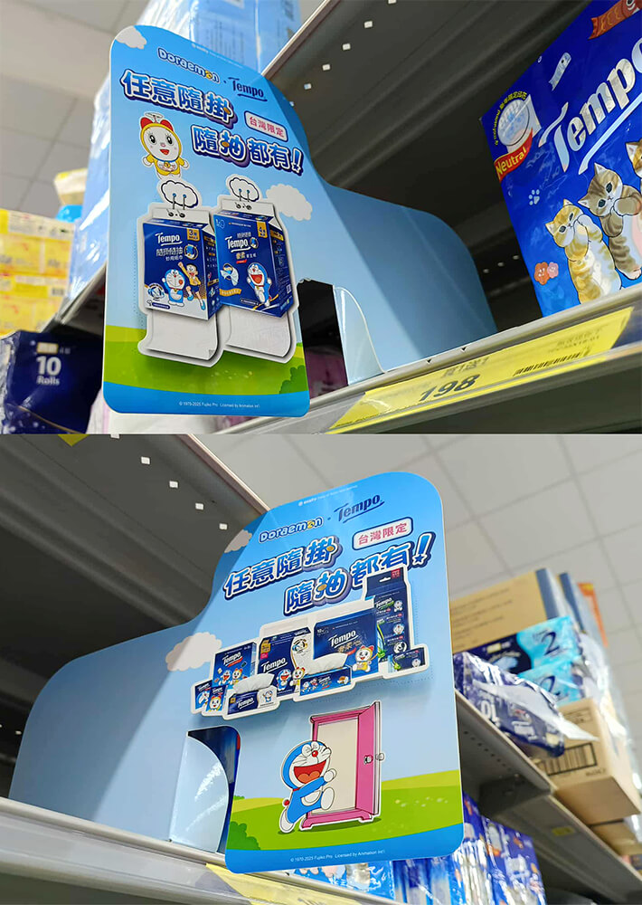 另外在家樂福賣場中,也能看到TEMPO衛生紙的廣告牌,不過從家樂福的賣場與線上購物來看,只有貓福珊迪款與一般素面款,似乎沒有進貨哆啦A夢款的限定包裝。