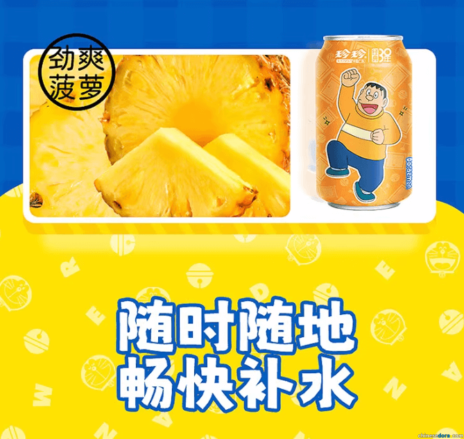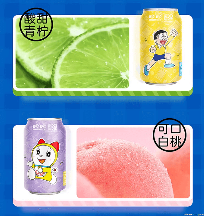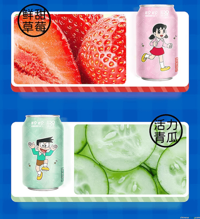 本次推出的聯名飲料,主打「隨時隨地,暢快補水」,特別是廠商使用了赤蘚醇(赤藻糖醇/赤蘚糖醇)代替蔗糖,每罐還含有約 100 毫克埃列克特洛。其中哆啦A夢對應爆爽青提味(藍色),大雄對應酸甜青檸味(黃色),哆啦美(多啦美)對應可口白桃味(紫色),靜香對應鮮甜草莓味(粉色),小夫對應活力青瓜味(靛色),胖虎則是勁爽菠蘿味(橙色)。