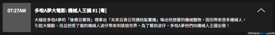 《電影多啦A夢:大雄與機械人王國》於 2025 年 9 月 13 日在 SUPER Kids Channel 播出,使用標題為「多啦A夢大電影: 機械人王國」。本圖片截取自節目表,為該播放日的首次播映。(資料圖片,myTV SUPER 網頁版截圖)