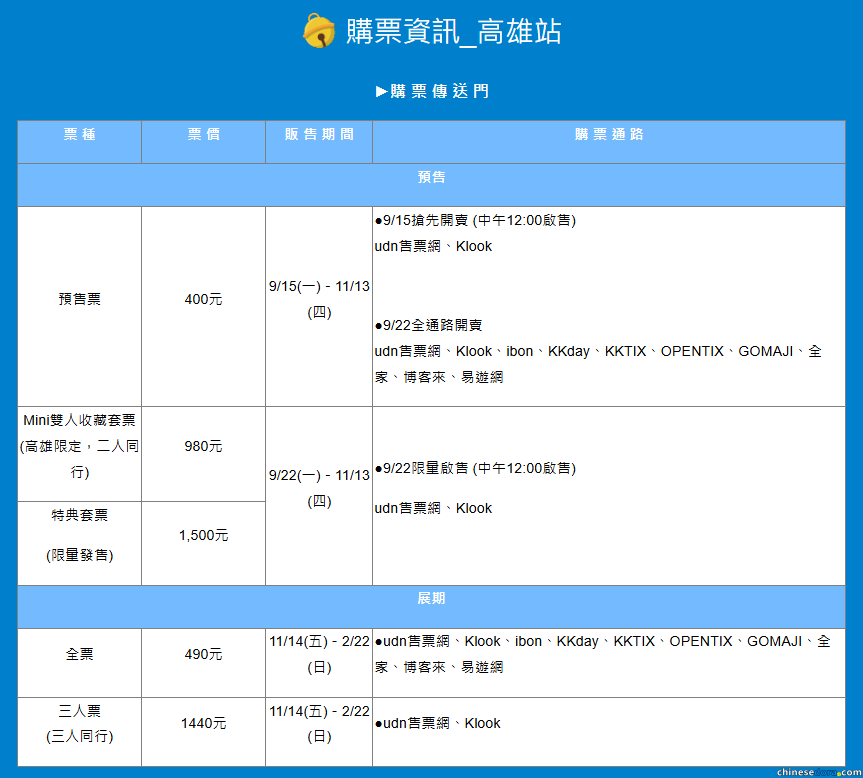 在高雄展覽舉辦的 11/14(五)-2/22(日) 期間,網上平台及現場都會發售一般門票。