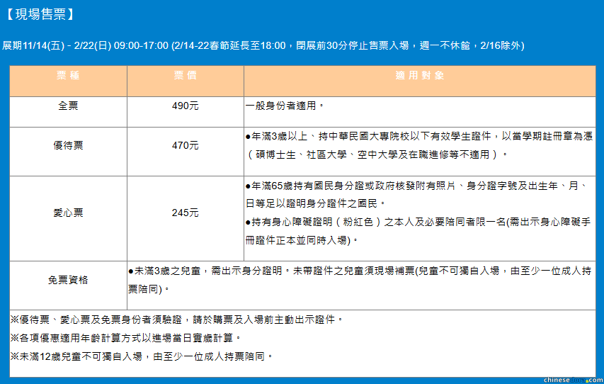 其他非一般身份者可親臨現場選購「優待票」(新台幣 470 元)、愛心票(新台幣 245 元),未滿 3 歲之兒童可享免票資格。有關詳情可參考官方網頁(或以上截圖)適用對象欄目的資料。