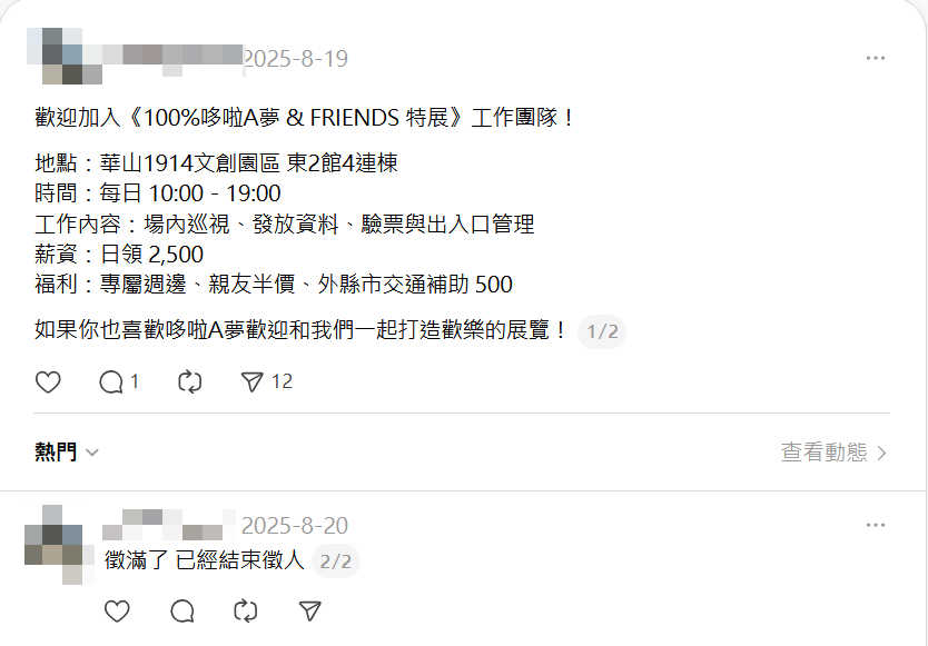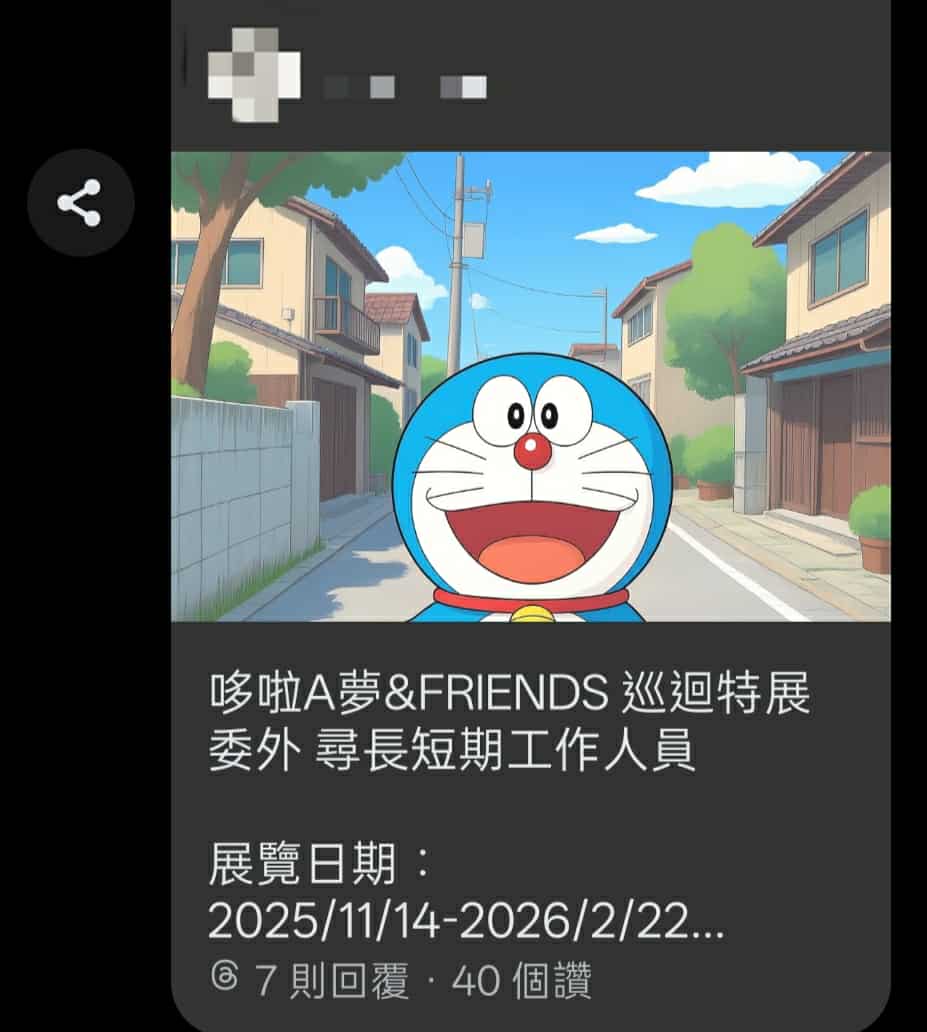 由聯合數位文創主辦的「100%哆啦A夢&FRIENDS」巡迴特展台灣站公佈 11 月將至高雄科工館舉行後,Threads(脆)上已出現詐騙的徵才廣告!