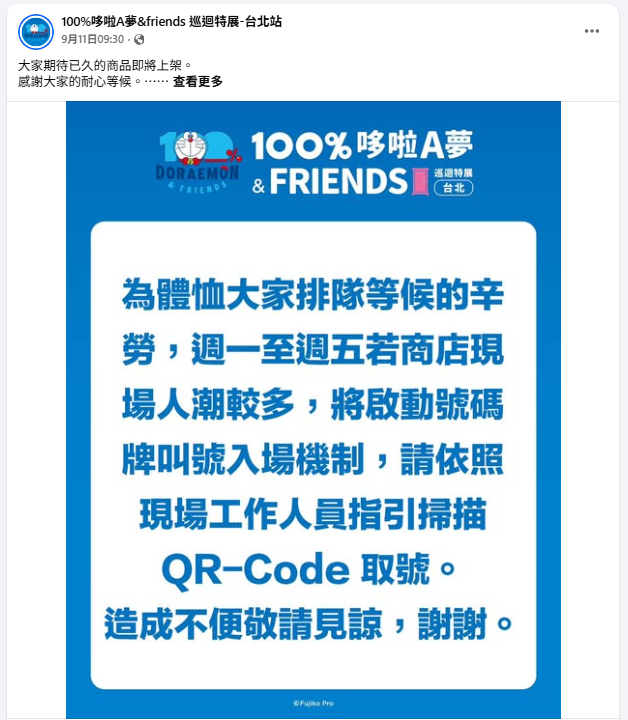 主辦單位於 9 月 11 日上午 9 時 30 分發佈貼文宣布「商店可能啟動叫號入場機制」。(資料圖片,100%哆啦A夢&friends 巡迴特展-台北站)