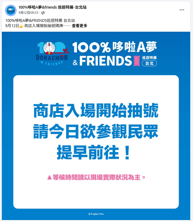 9 月 12 日上午 8 時 55 分發布貼文宣佈「商店入場開始抽號」。(資料圖片,100%哆啦A夢&friends 巡迴特展-台北站)