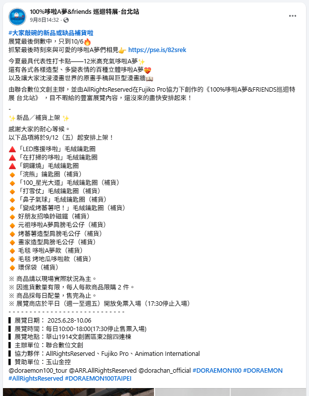 主辦單位於 9 月 8 日下午 2 時 32 分發佈貼文宣佈「9 月 12 日補貨資訊」。(資料圖片,100%哆啦A夢&friends 巡迴特展-台北站)