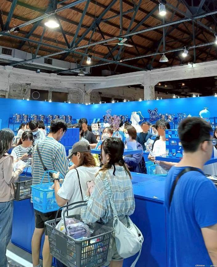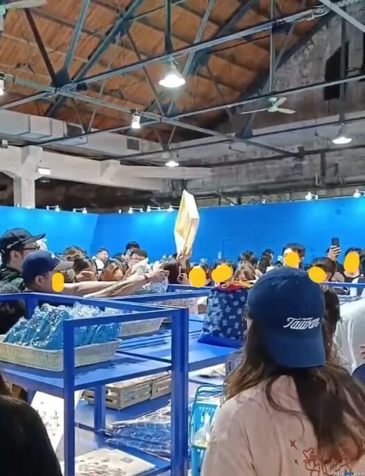 入場後看到空曠的展區就知道,首批入場民眾大多先去商品區進行購物,購物籃全都是這次補貨的娃娃,即使工作人員在現場提醒「每人限購兩個」、「請盡快結帳離場」,仍無法阻止在娃娃區等待補貨的人。