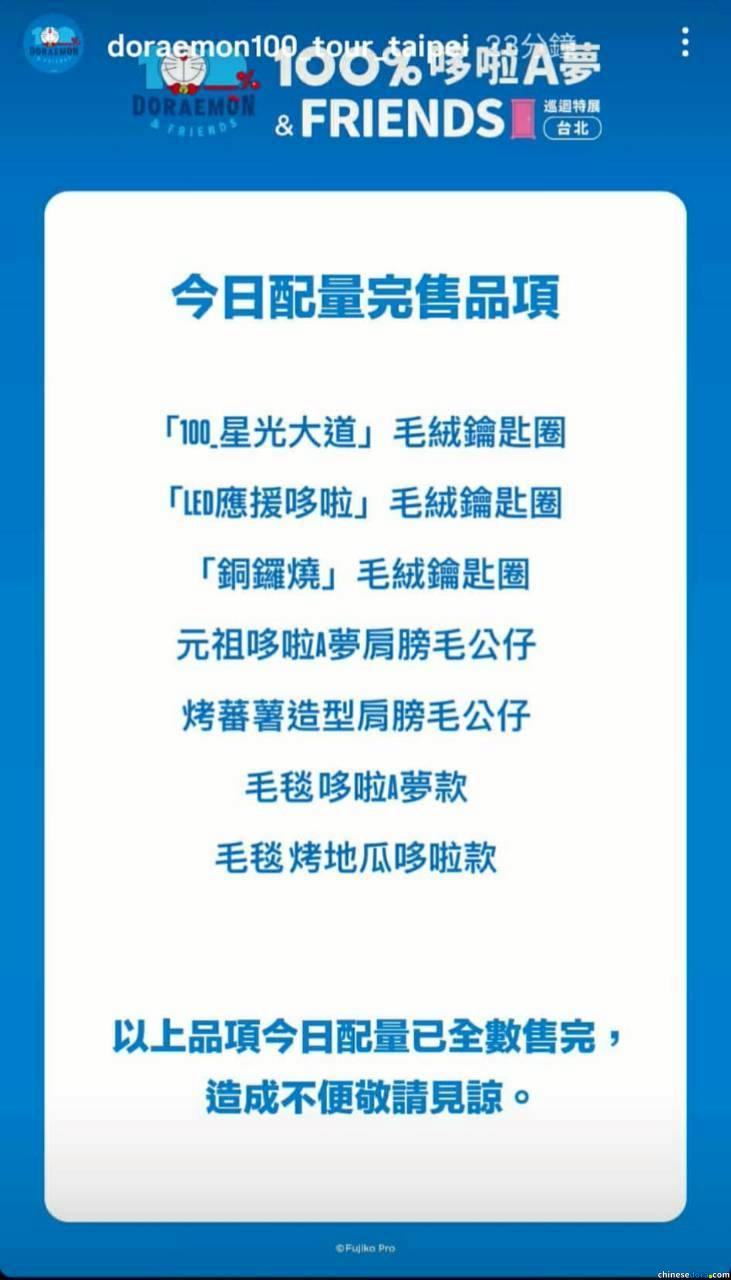 9月13日中午13:40完售品項(100%哆啦A夢& friends 巡迴特展-台灣站)
