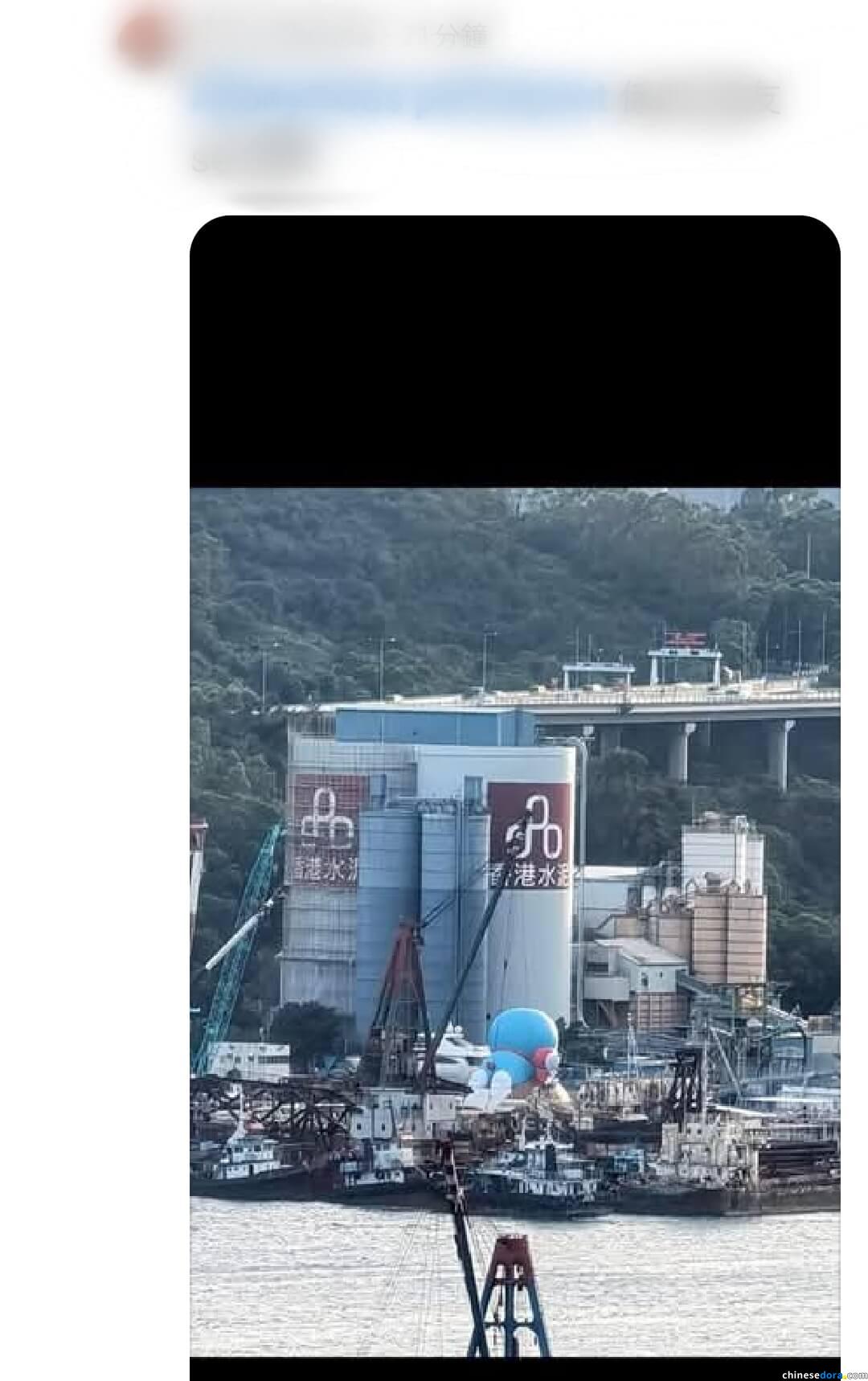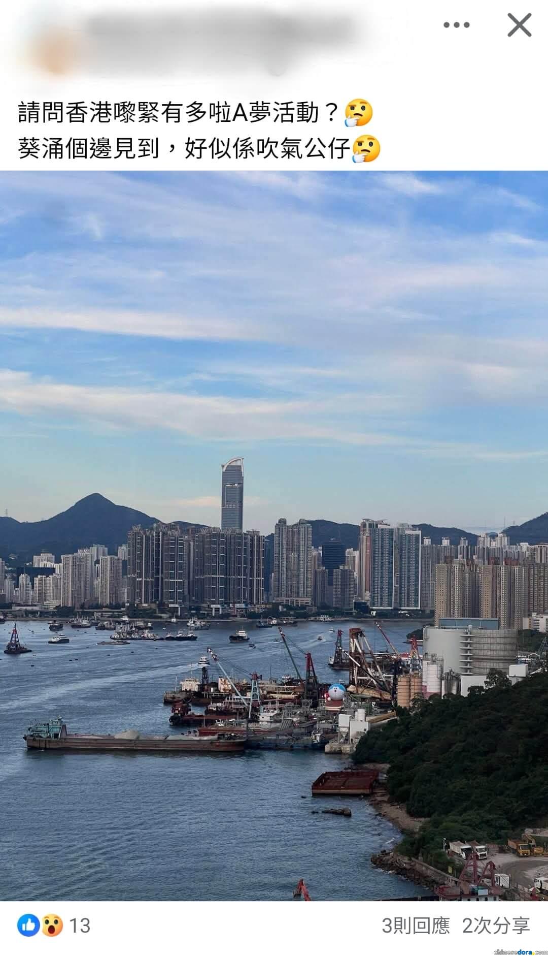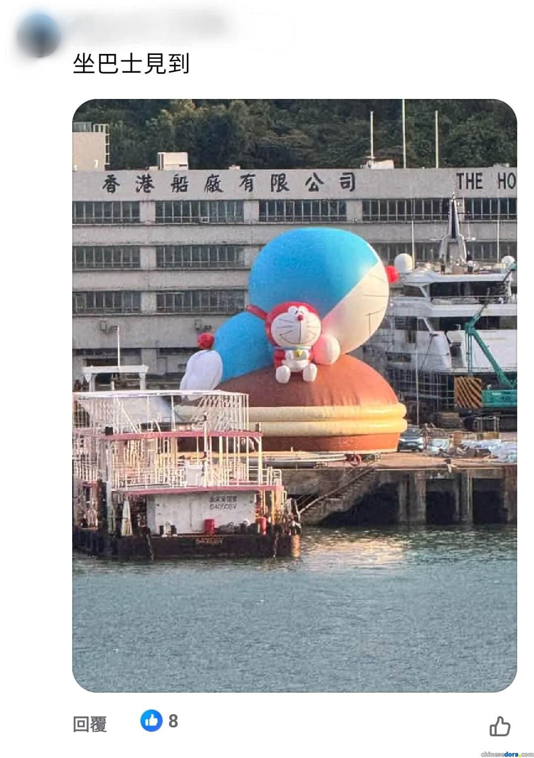 近日有網民分享了一張從葵涌拍攝的照片,可見船塢有一款巨型的多啦A夢充氣氣球,造型是多啦A夢躺在巨型豆沙包上,旁邊還有紅色的迷你多啦,看起來是從未曝光的新款式。