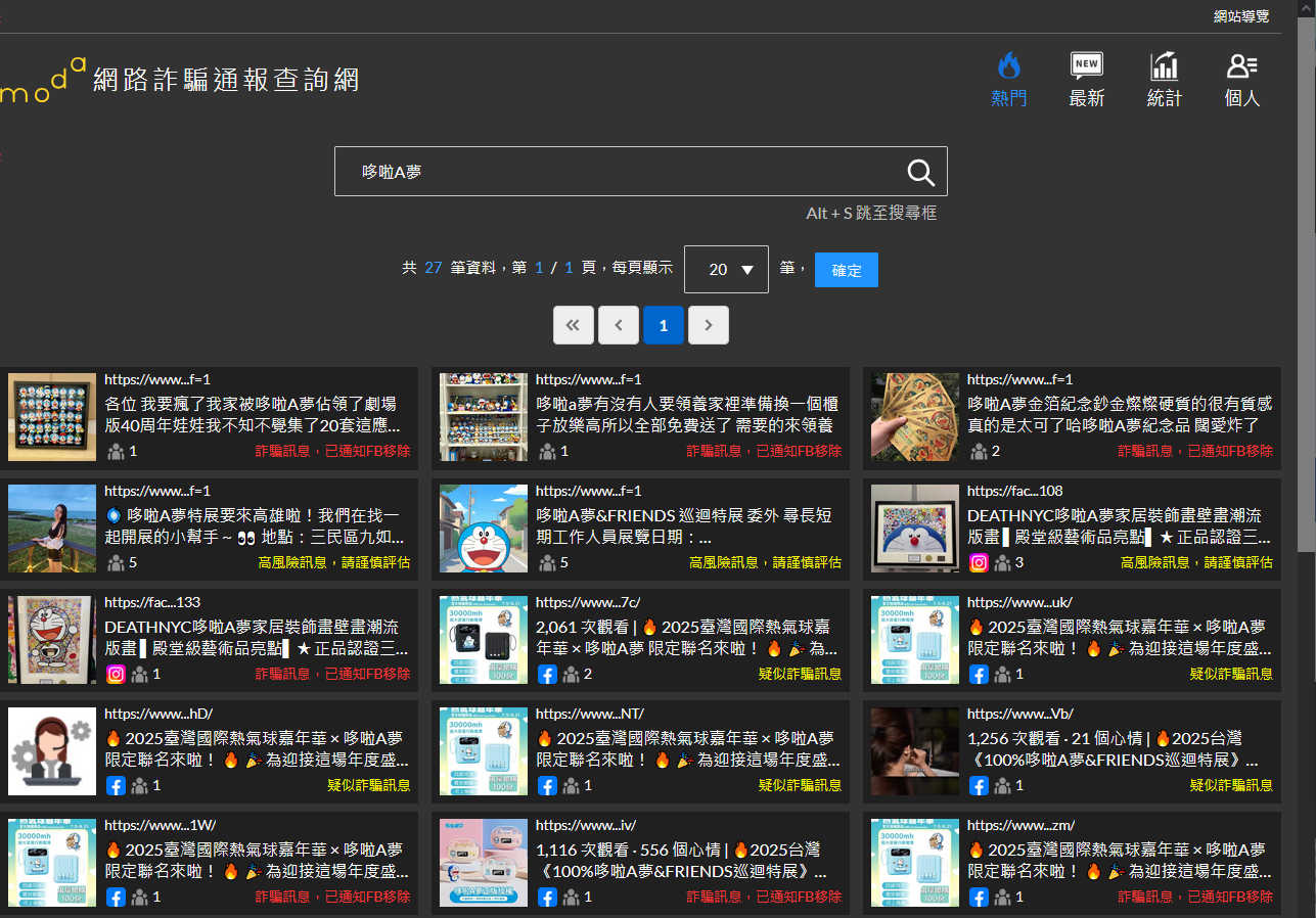 台灣數發部「網路詐騙通報查詢網」中,以「哆啦A夢」搜尋關鍵字,就能查到近期這些相關詐騙貼文。記者的一位行銷業友人提到,民眾能上去網站通報詐騙貼文,數發部確認詐騙訊息後,會通知 Facebook 移除詐騙貼文,比起在 Facebook 檢舉可能會更有效。