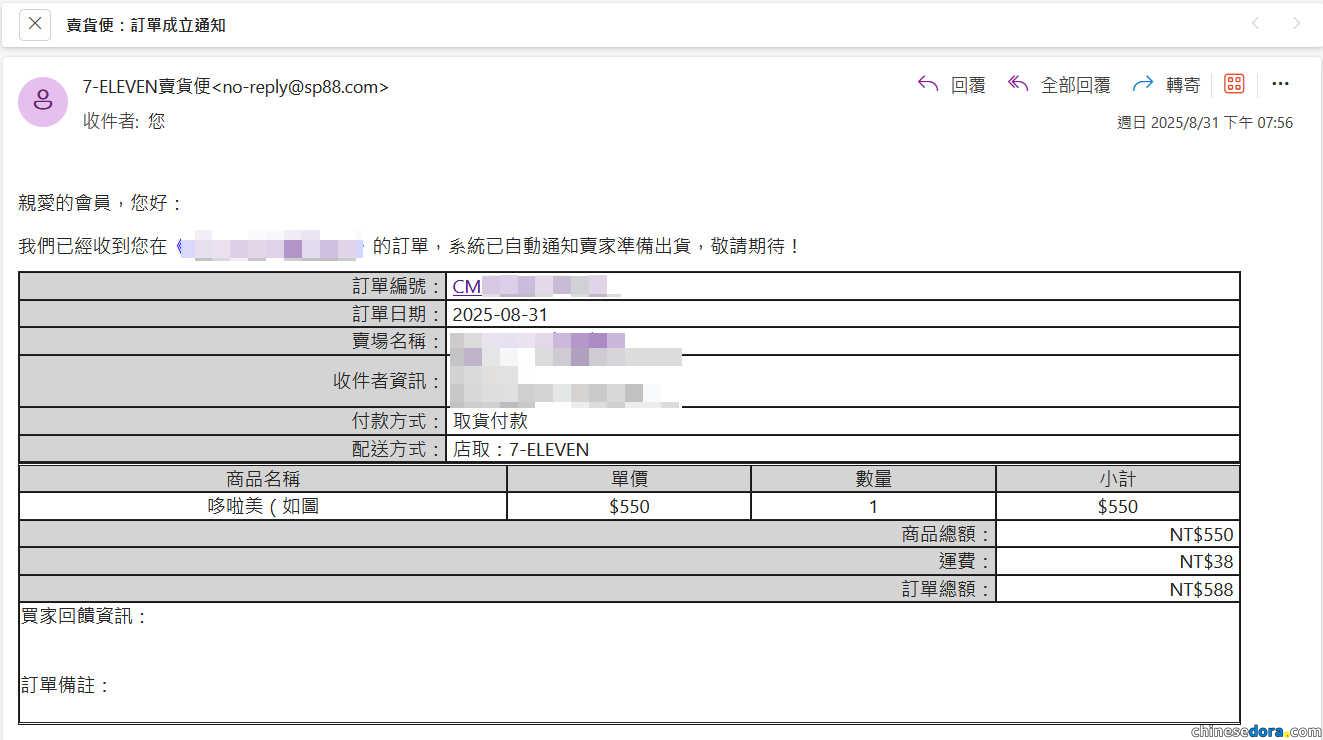 訂單成立後,賣貨便官方會寄送訂單資訊至 E-mail 中,賣家安排出貨會通知第二封,門市到貨後會再寄第三封 mail 通知準備取貨,中間不會有任何要求匯款等行為。