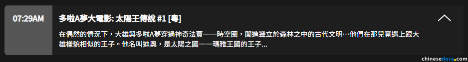 《電影多啦A夢:大雄的太陽王傳說》於 2025 年 9 月 27 日在 SUPER Kids Channel 播出,使用標題為「多啦A夢大電影: 太陽王傳說」。本圖片截取自節目表,為該播放日的首次播映。(資料圖片,myTV SUPER 網頁版截圖)