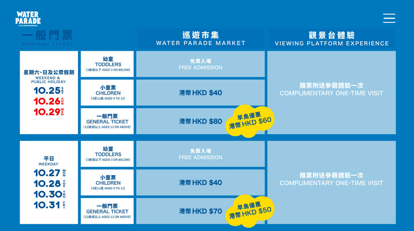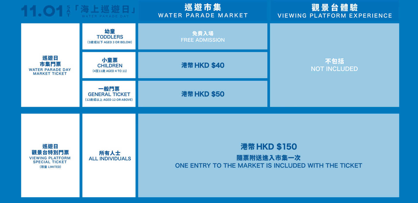 「巡遊市集」早鳥優惠門票於 9 月 26 日中午 12 時起透過購票平台 klook 預購,成人票由港幣 50 元起,小童票為港幣 40 元,數量有限,售完即止。另設即場發售門票,視乎現場門票實際發售情況。