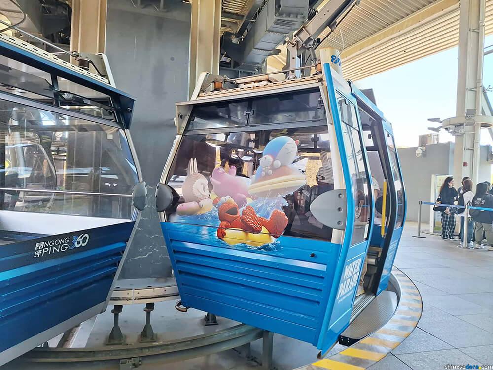 至於這次活動合作的五款車廂,都用上了海報的圖案,巨大的角色貼在車廂兩側。纜車車門及對面的車窗則預留空間,大家乘坐纜車的時候可以沿途觀賞風景。而且聯名款纜車都是水晶車廂,可以從車底的透明玻璃俯視大嶼山的景色。