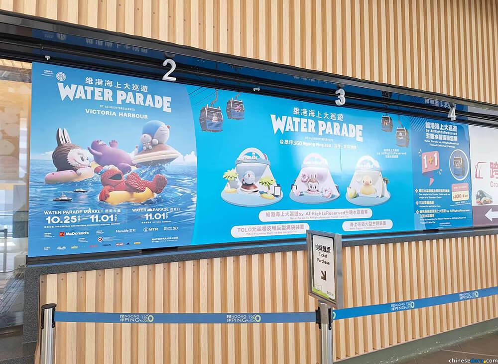 目前在「昂坪纜車東涌站」售票處,已可看到「維港海上大巡遊」的活動焦點海報與售票資訊,中間第三個窗口貼上了昂坪市集中出現的三個大型主題裝置。