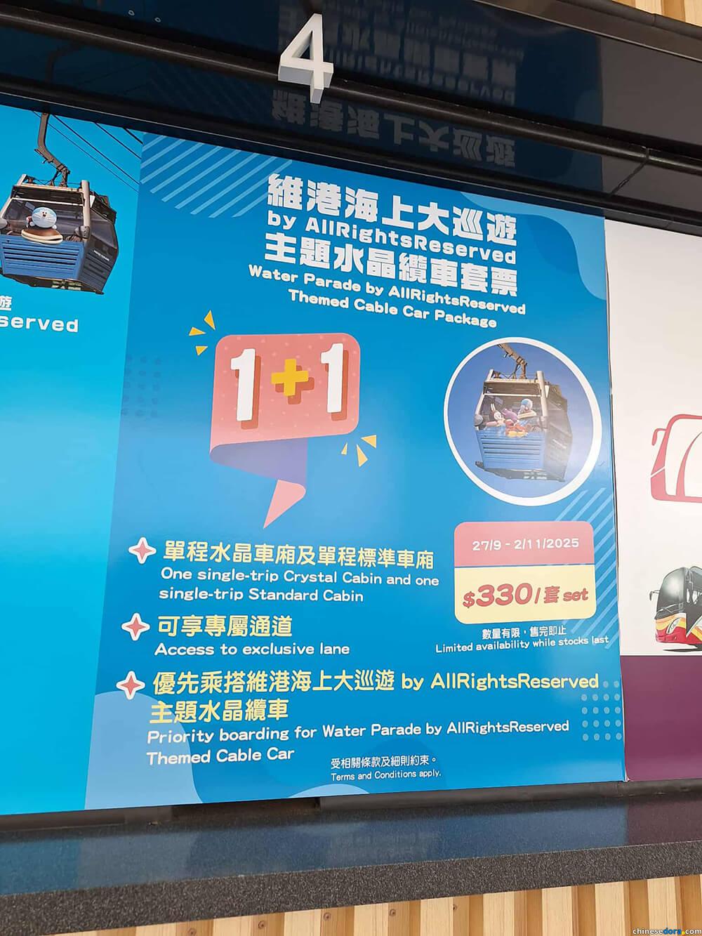 昂坪360 也推出「維港海上大巡遊」主題水晶纜車套票,售價為港幣 330 元一 set,包含二人適用的「單程水晶車廂」(主題纜車所屬種類)及「單程普通車廂」纜車門票,套票限量發售中,售完即止。