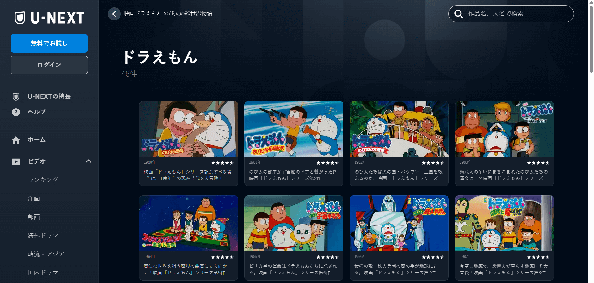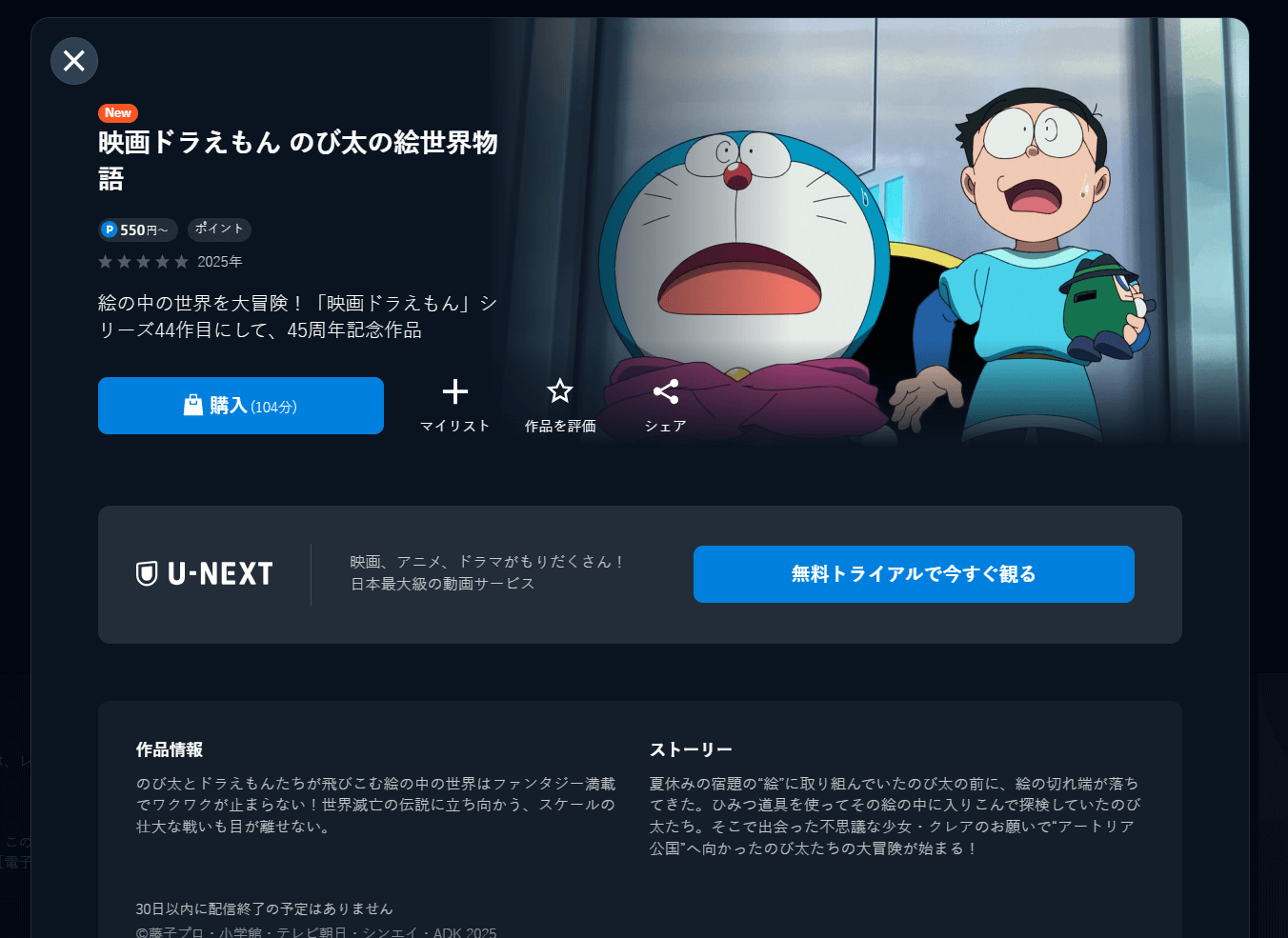 U-NEXT 是日本知名的影音串流平台,擁有大量日劇、電影、動畫與綜藝內容,包括歷年來所有的電影《哆啦A夢》作品、《STAND BY ME 哆啦A夢》兩部劇場版,以及電視動畫版《哆啦A夢》等相關作品。