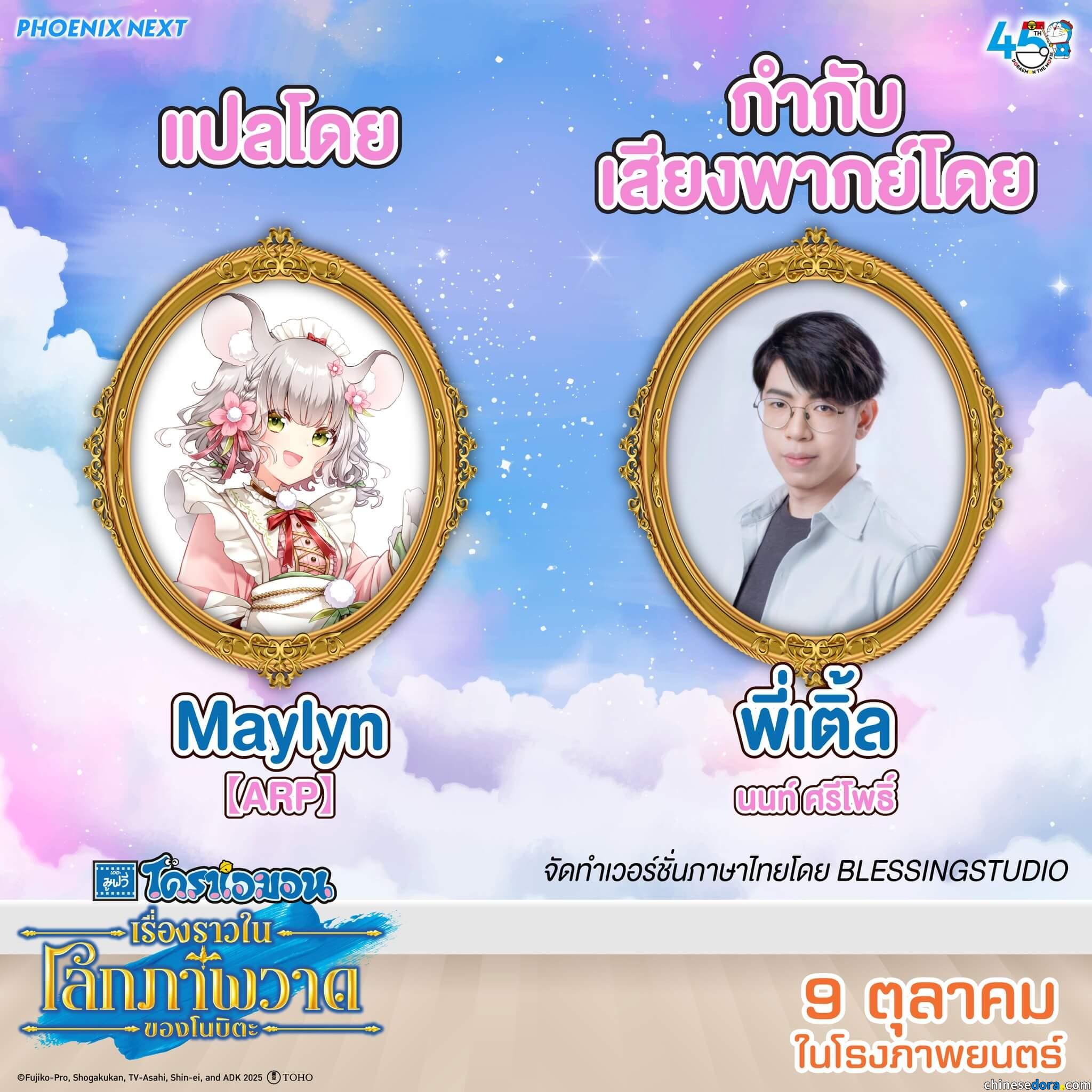而《大雄的繪畫世界物語》泰國版的幕後製作團隊,左邊為負責翻譯劇本的 Maylyn,同樣隸屬於 ARP 事務所的 Vtuber,形象以龍貓外型呈現,以輕鬆日常的氛圍與粉絲互動。右邊則是泰語版的配音導演 P’Tle Non Sepho(พี่เติ้ล นนท์ ศรีโพธิ์),在《大雄與天空的理想鄉》泰國版電影聲演索尼亞,近日他於自己的社群媒體分享感言,表示「從小時候在電視前看哆啦A夢,到今天能親自擔任泰語版配音導演,這是我夢想成真的一刻」。