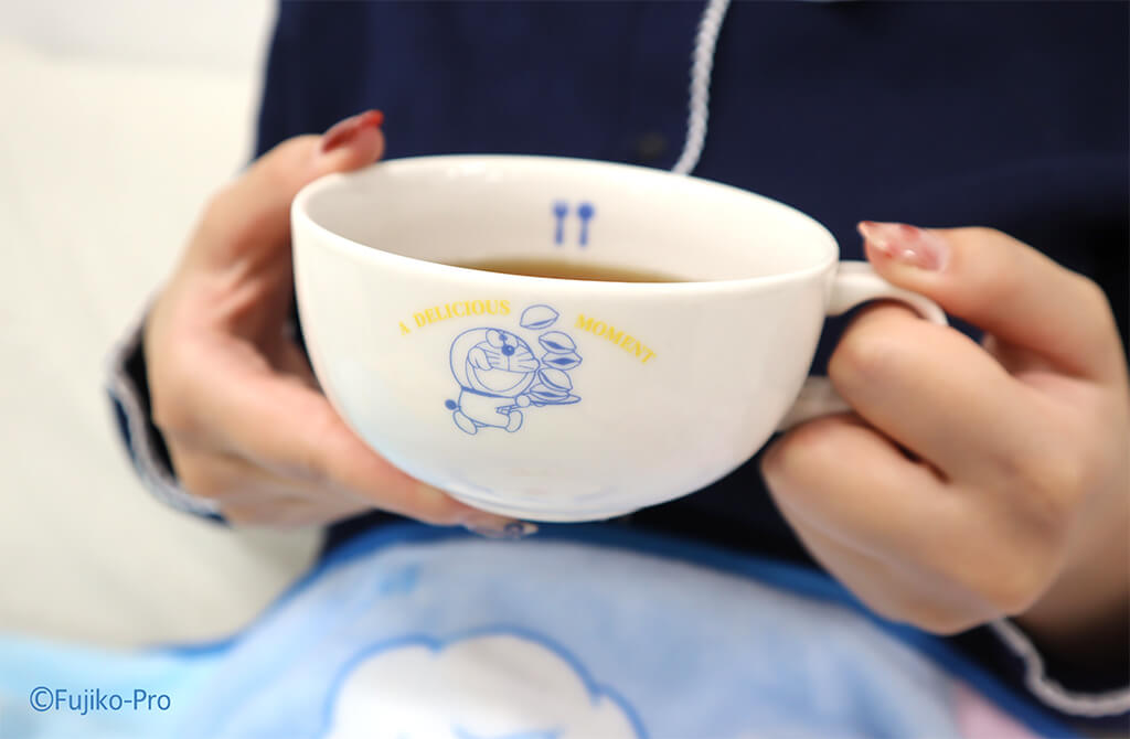 可用來盛裝熱湯、飲品或優格(乳酪),是兼具實用與可愛的萬用杯。杯身一側印有準備大吃銅鑼燒(豆沙包)的哆啦A夢(多啦A夢),另一側則有令人食指大動的甜點插圖。