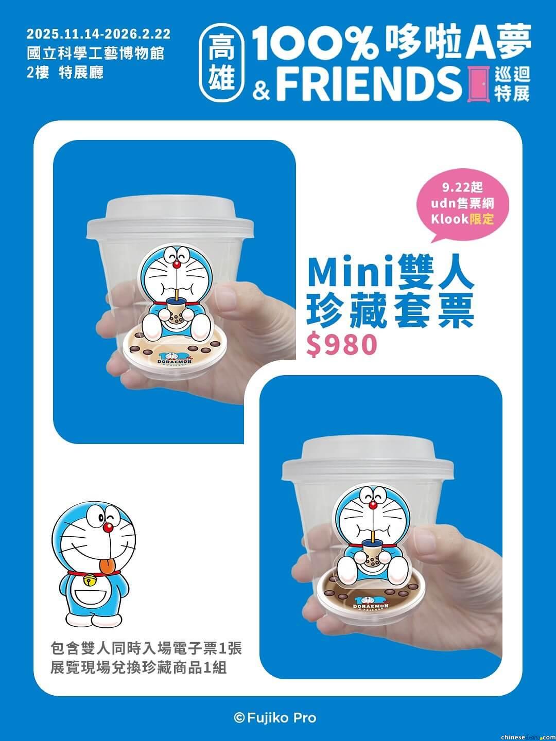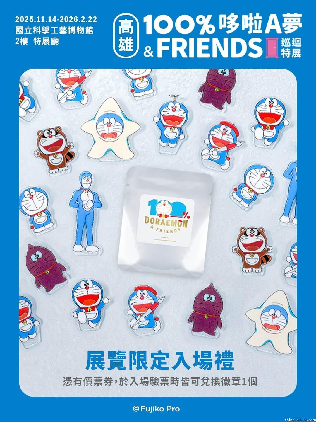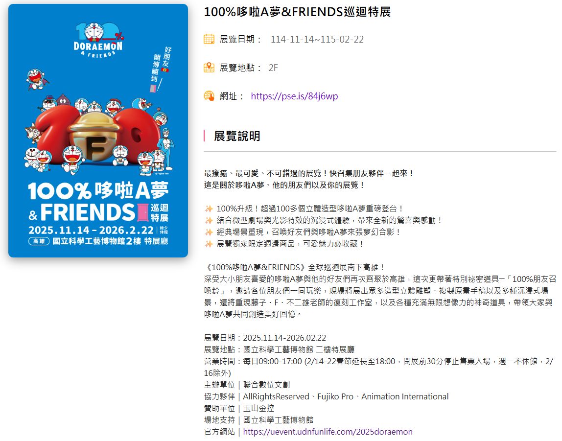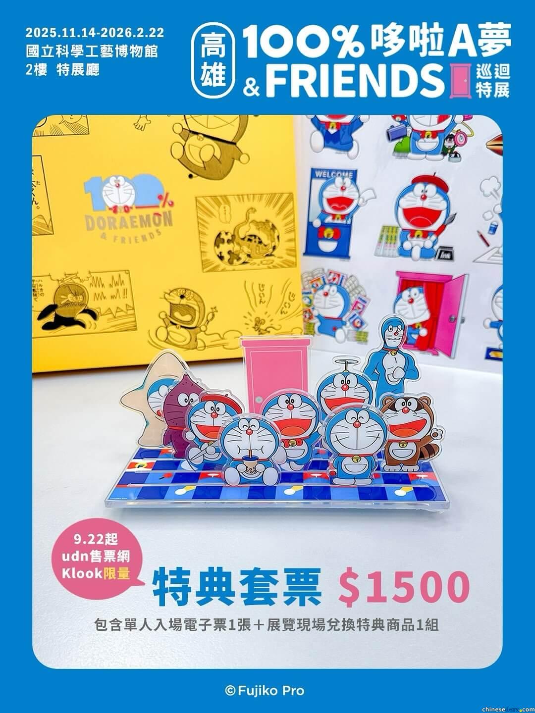 「100%哆啦A夢&FRIENDS」巡迴特展在亞洲各地陸續展出,台灣首站於台北引起轟動,緊接將會在 11 月 14 日正式在高雄開幕,繼續由「聯合數位文創」擔任主辦單位,選用「國立科學工藝博物館」場地舉辦。