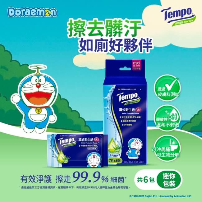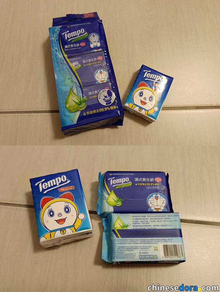 德國家用紙品牌 TEMPO 在台灣推出哆啦A夢(港譯:多啦A夢)限定包裝的家用紙品,新商品「濕式衛生紙」也推出哆啦A夢的可愛圖案包裝囉,在屈臣氏也可以買到!
