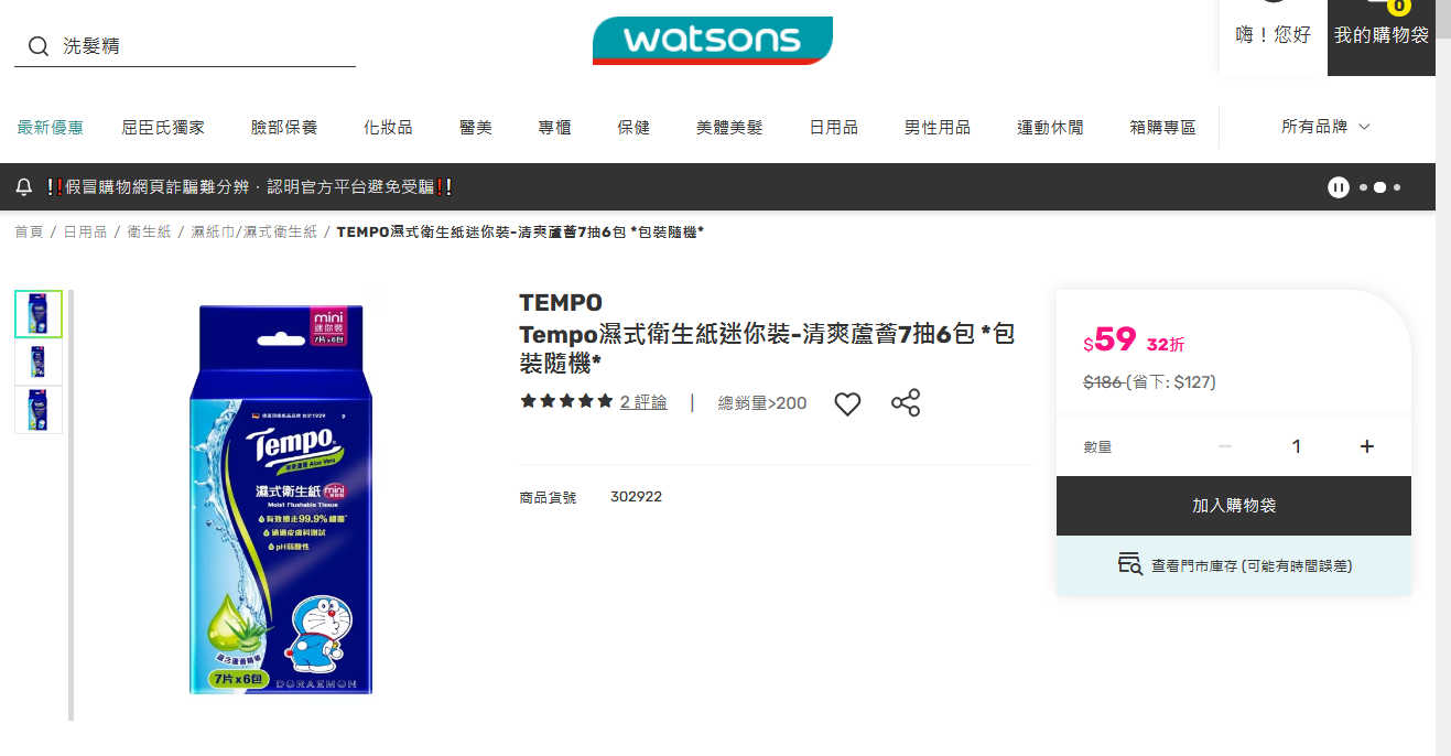 記者在屈臣氏(watsons)門市以 59 元加價購買這款「Tempo 濕式衛生紙迷你裝」,一共有 6 入,外包裝上都印有可愛的哆啦A夢圖案。