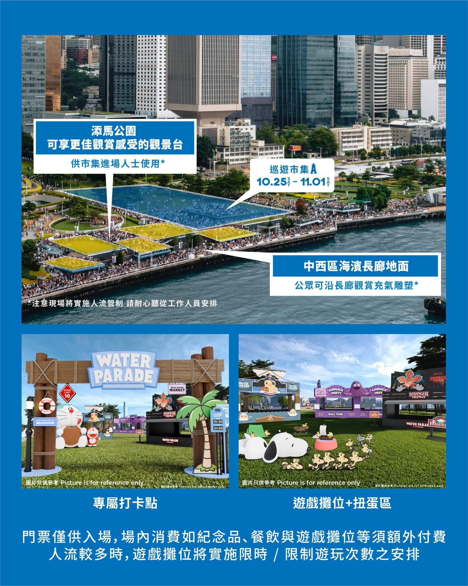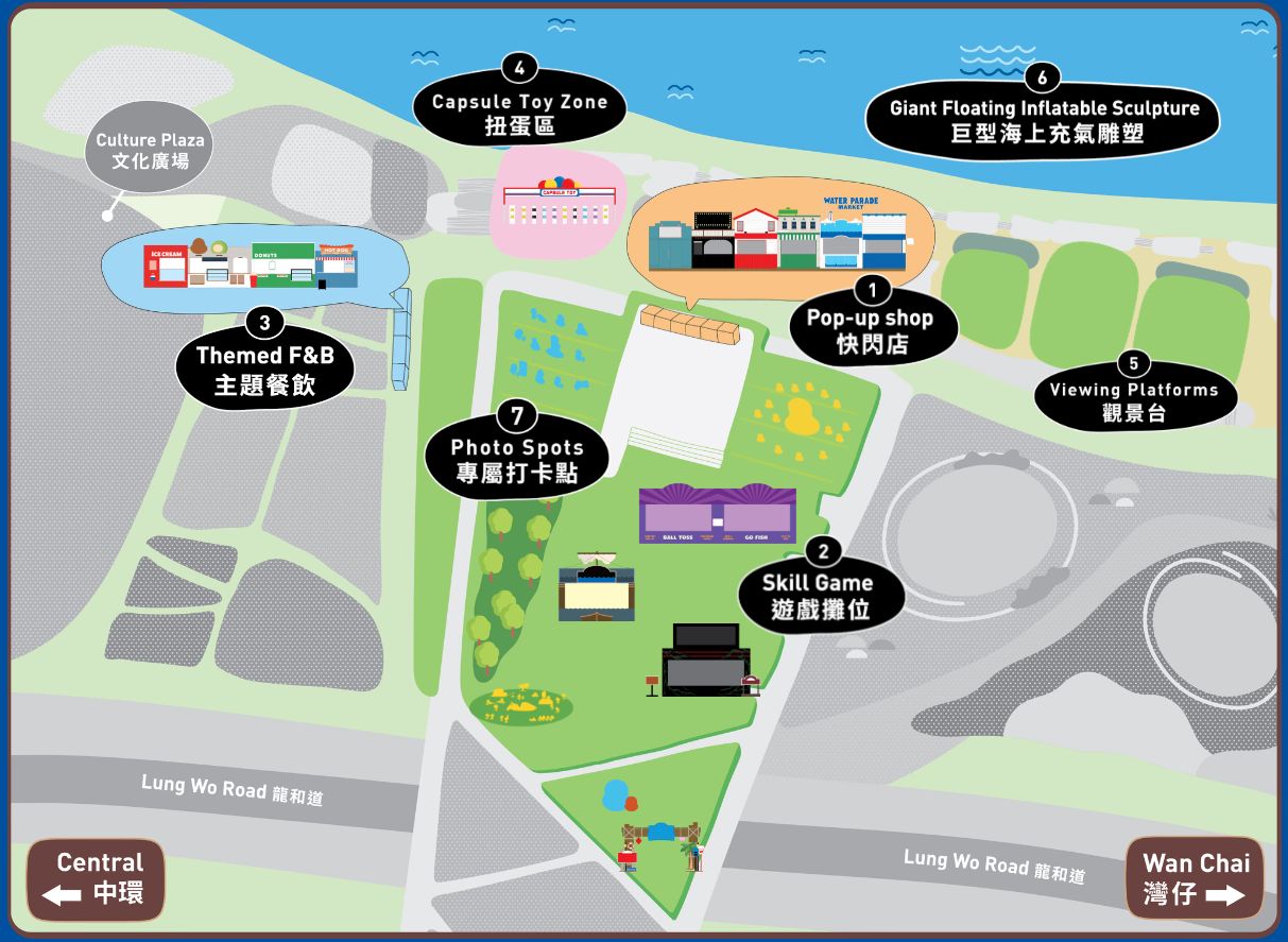 在特別開設的活動網頁 waterparade.com,其實早已公開了巡遊市集的平面圖規劃,連同主打「海上充氣展品」及「觀景台」,還有 5 個市集區域包含各項食、買、玩體驗,看起來就像把主題樂園、代理商展銷攤位等概念集合起來。