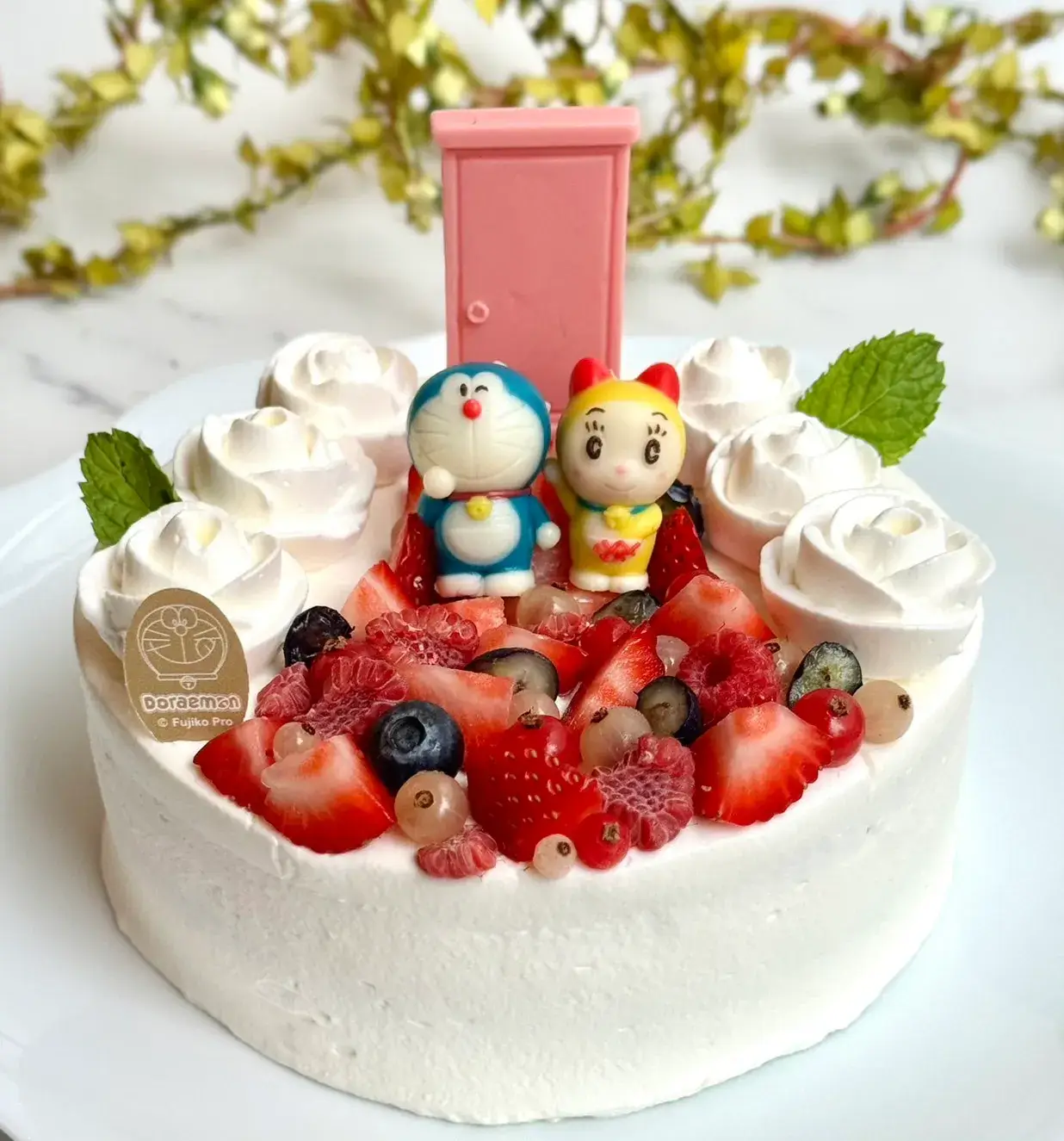 「任意門!大家好蛋糕」、「大家一起慶祝的銅鑼燒蛋糕」蛋糕基底為戚風蛋糕,使用日本進口的鮮奶油,以及滿滿四種當季新鮮水果。蛋糕上的哆啦A夢和哆啦美、任意門,是用乳酪起司蛋糕製作而成,小巧又精緻!「大家一起慶祝的銅鑼燒蛋糕」中間還放上了三層銅鑼燒造型的小蛋糕,十月壽星就與哆啦A夢一起慶生吧!