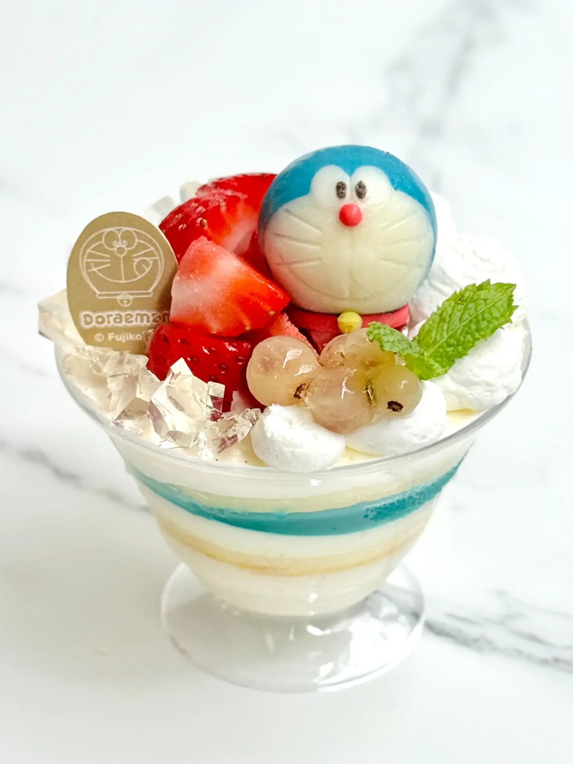 查佛(Trifle)系列上面鋪滿香草、芒果慕斯,並使用了台灣新鮮水果製作的果凍,哆啦A夢與哆啦美的本體也使用乳酪起司蛋糕製作,每一種配料可以單獨吃,一起吃更加增添口感的豐富層次。