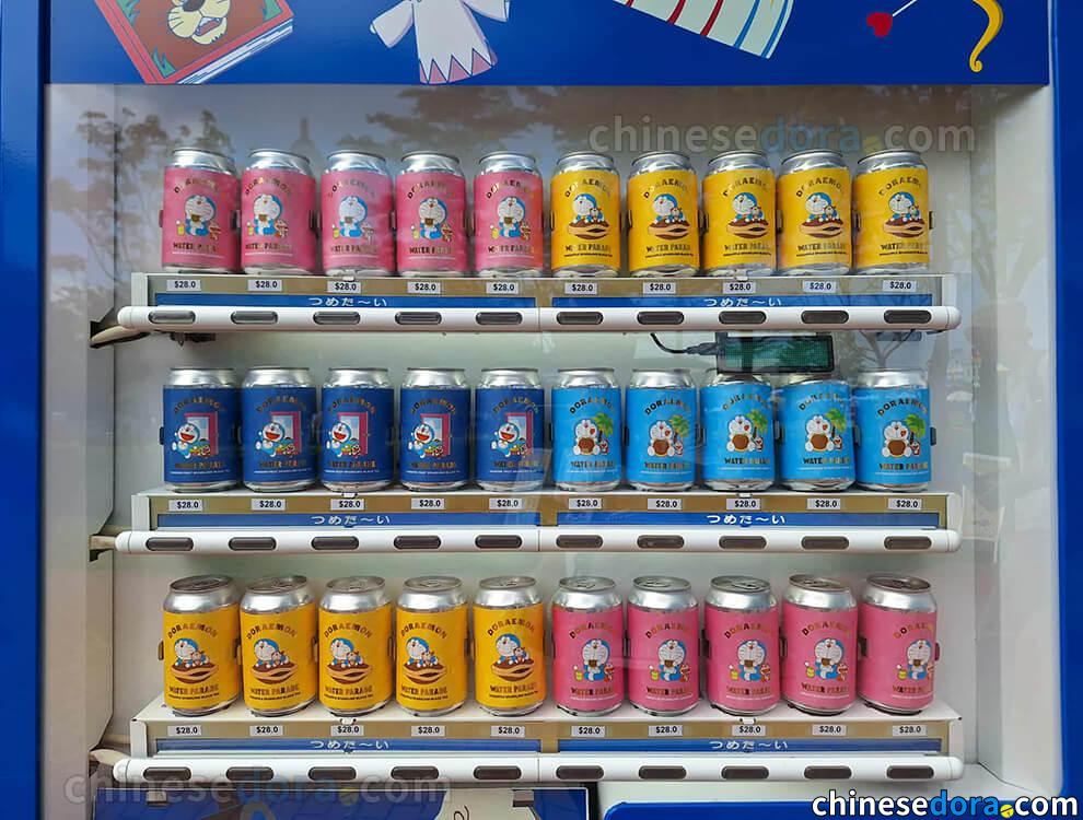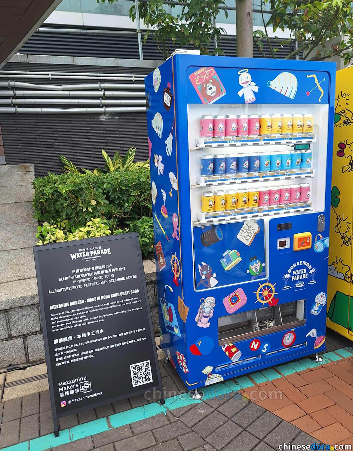 除了新鮮製造食品,跟香港品牌「閣樓釀造」聯名的多啦A夢罐裝汽水也是在這邊發售。在商店旁邊就放著幾部發售主題汽水的自動販賣機。