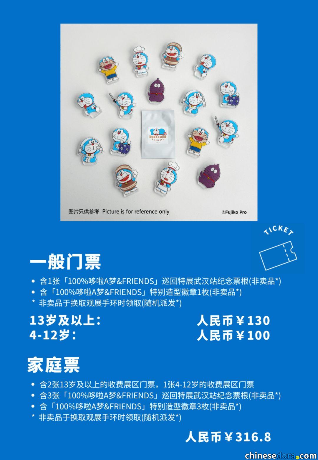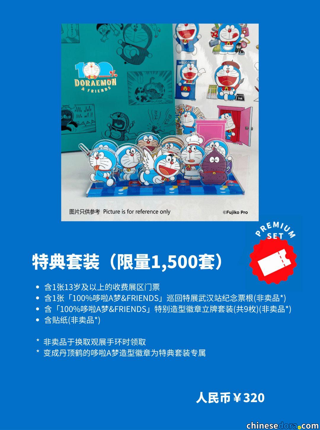 「特典套票」(人民幣 320 元)包含門票,還有徽章套裝(含底座)及限定貼紙一張。徽章套裝除了可以一次得到上述提及的 8 款徽章,還有特典限定的「任意門」(港譯:隨意門)及武漢限定「變成丹頂鶴的哆啦A夢」!