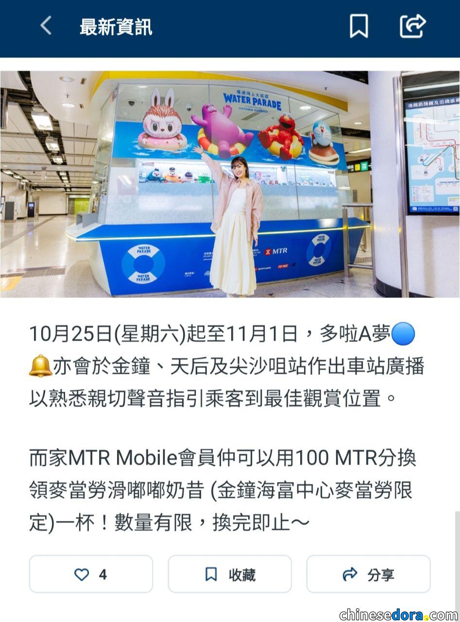 [香港] 「維港海上大巡遊 港鐵車站廣播」金鐘率先上線 每15分鐘播一次、TV版多啦A夢配音員黃昕瑜聲演
