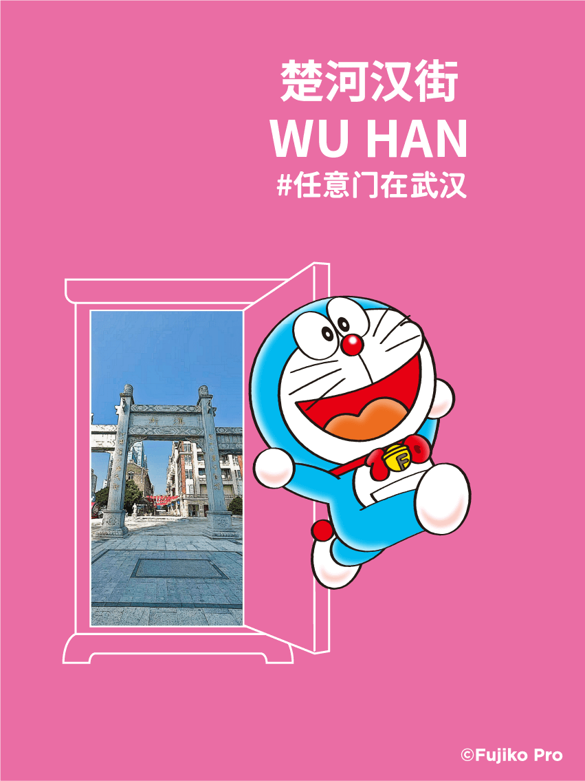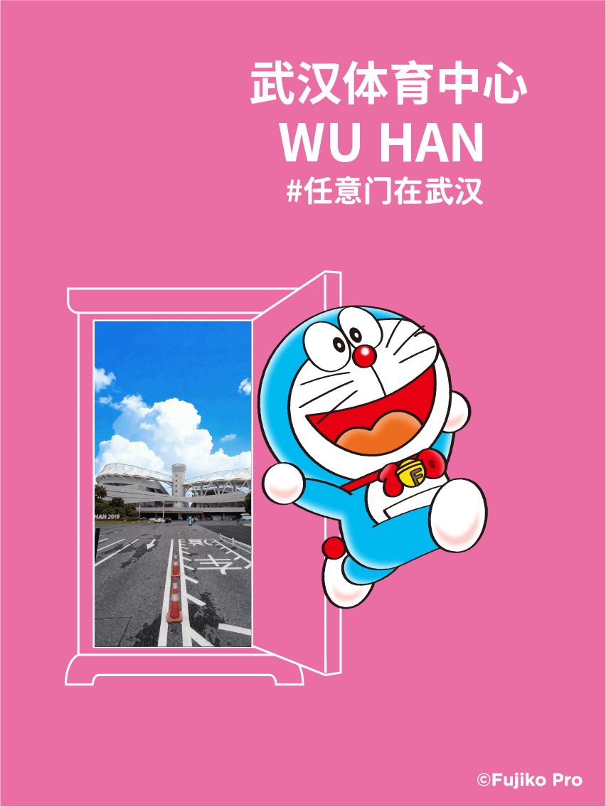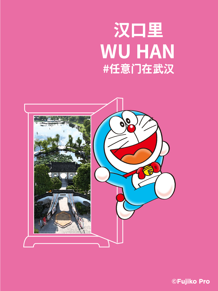 武漢站的打卡活動在 2025 年 10 月 31 日至 2026 年 1 月 4 日舉行,與任意門互動合影發抖音,並帶上活動話題「#任意门在武汉 #跟着哆啦A梦打卡武汉」(簡體字),即可在武漢恒隆廣場 B1 服務台領取週邊一份。數量有限,換完即止。