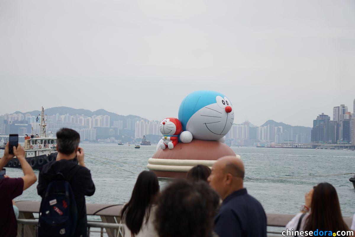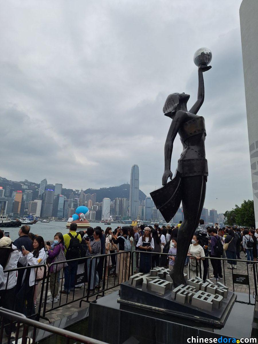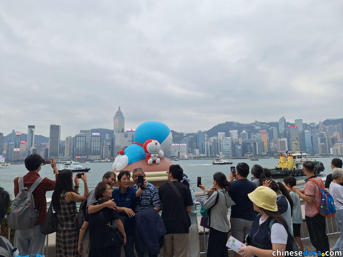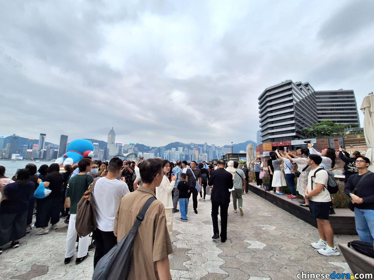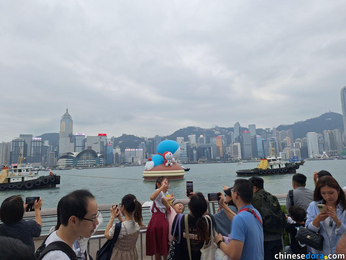 不少民眾舉機拍照,除了拍下多啦A夢與香港的景色,也不忘自己與一家大小和同行友伴合照留念,還有特別帶著從市集買的紀念品來「夢幻合影」。