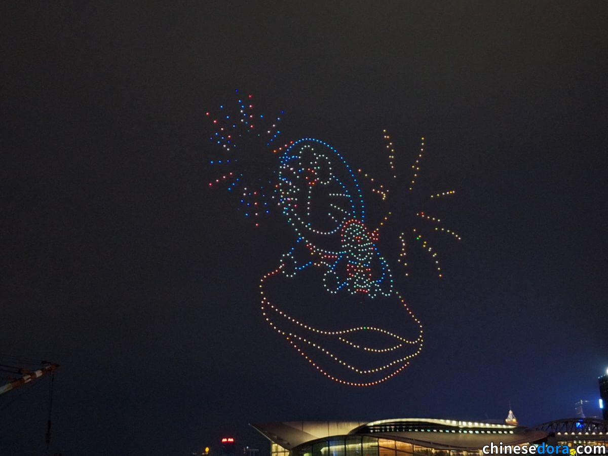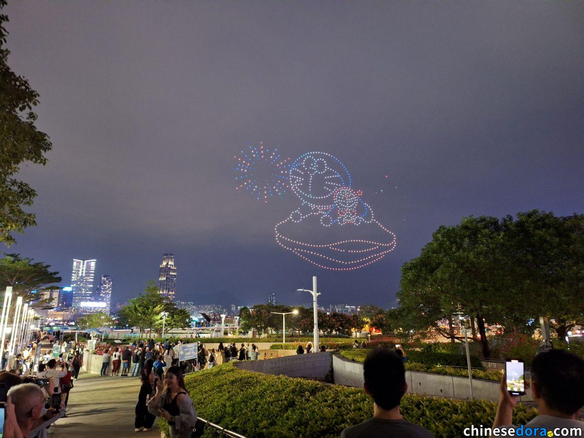 「多啦A夢」與「迷你多啦」伏在豆沙包的圖案伴隨仿煙花動態的無人機燈效在夜空出現,就像把多啦A夢「維港水上飄」的景象搬到天空上再次呈現。
