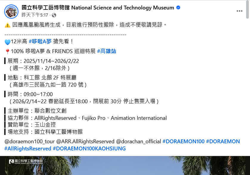 不過,因下週鳳凰颱風即將生成,根據氣象預報11日-13日將會影響台灣,主辦單位已提前進行預防性撤除。雖然哆啦A夢暫時去休息了,等下週天氣穩定後,還會出現在科工館,陪大家一起迎接展覽開幕。並且憑「100%哆啦A夢&FRIENDS」巡迴特展票根,國立科學工藝博物館內常設展示廳及電影團體皆享有優惠價!