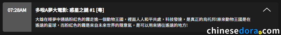 ※以上節目時段來自 myTV SUPER 網頁版的節目表。節目「開播時間」的部分以《多啦A夢》節目的開始時間作標記,「結束時間」的部分列出下一節目的開始時間以作參考。
